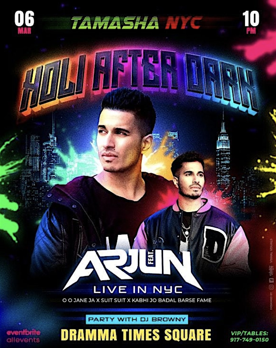 by admin27Feb NYC HOLI IN THE DARK FT. ARJUN @DRAMMA TIMES SQUARE at DRAMMA TIMES SQUARE – New York, NY NYC HOLI IN THE DARK FT. ARJUN @DRAMMA TIMES SQUARE at DRAMMA TIMES SQUARE – New York, NY 4 4 people viewed this event. Get ready to experience the vibrant colors and energy of Holi After Dark with Arjun – it’s going to be a night to remember! Tickets-RSVP Link Date And Time Friday, March 6th, 2026 @ 10:00 PM Location 1604 Broadway, New York, NY 10019 Event Types Party or Social Gathering Event Category New YorkNew York City Share With Friends Facebook Twitter Linkedin Xing Pinterest Share This Post: