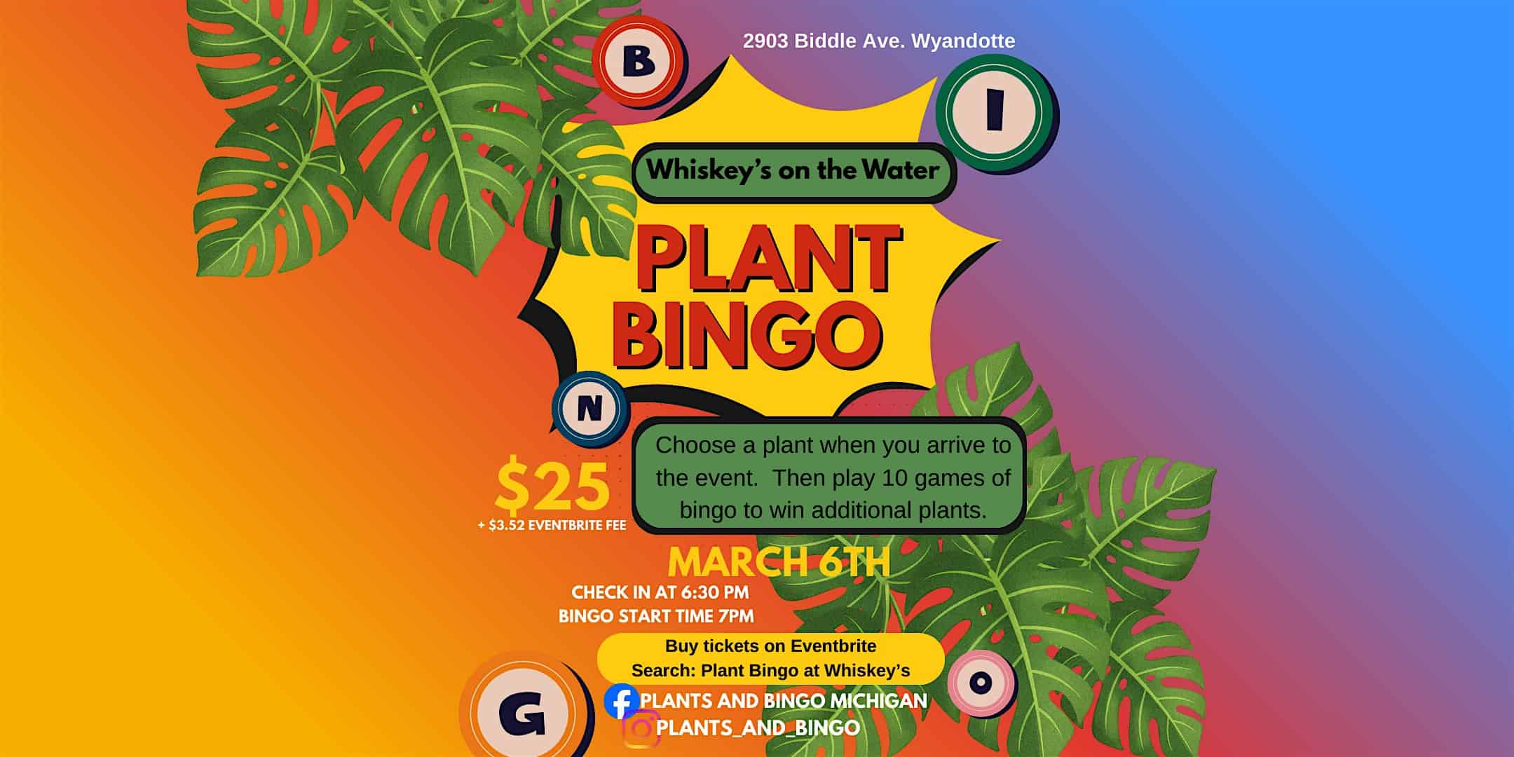 by admin23Feb Plant Social at Whiskeys on the Water in Wyandotte at Whiskeys on the Water – Wyandotte, MI Plant Social at Whiskeys on the Water in Wyandotte at Whiskeys on the Water – Wyandotte, MI 2 2 people viewed this event. Enjoy a fun night out with friends and family while learning about plants and playing complimentary plant bingo and shopping our plant sale! Tickets-RSVP Link Date And Time Friday, March 6th, 2026 06:00 PM (PST) Venue Whiskeys on the Water Location 2903 Biddle Avenue, Wyandotte, MI 48192 Event Types Food & DrinkParty or Social Gathering Event Category DetroitMichigan Share With Friends Facebook Twitter Linkedin Xing Pinterest Share This Post: