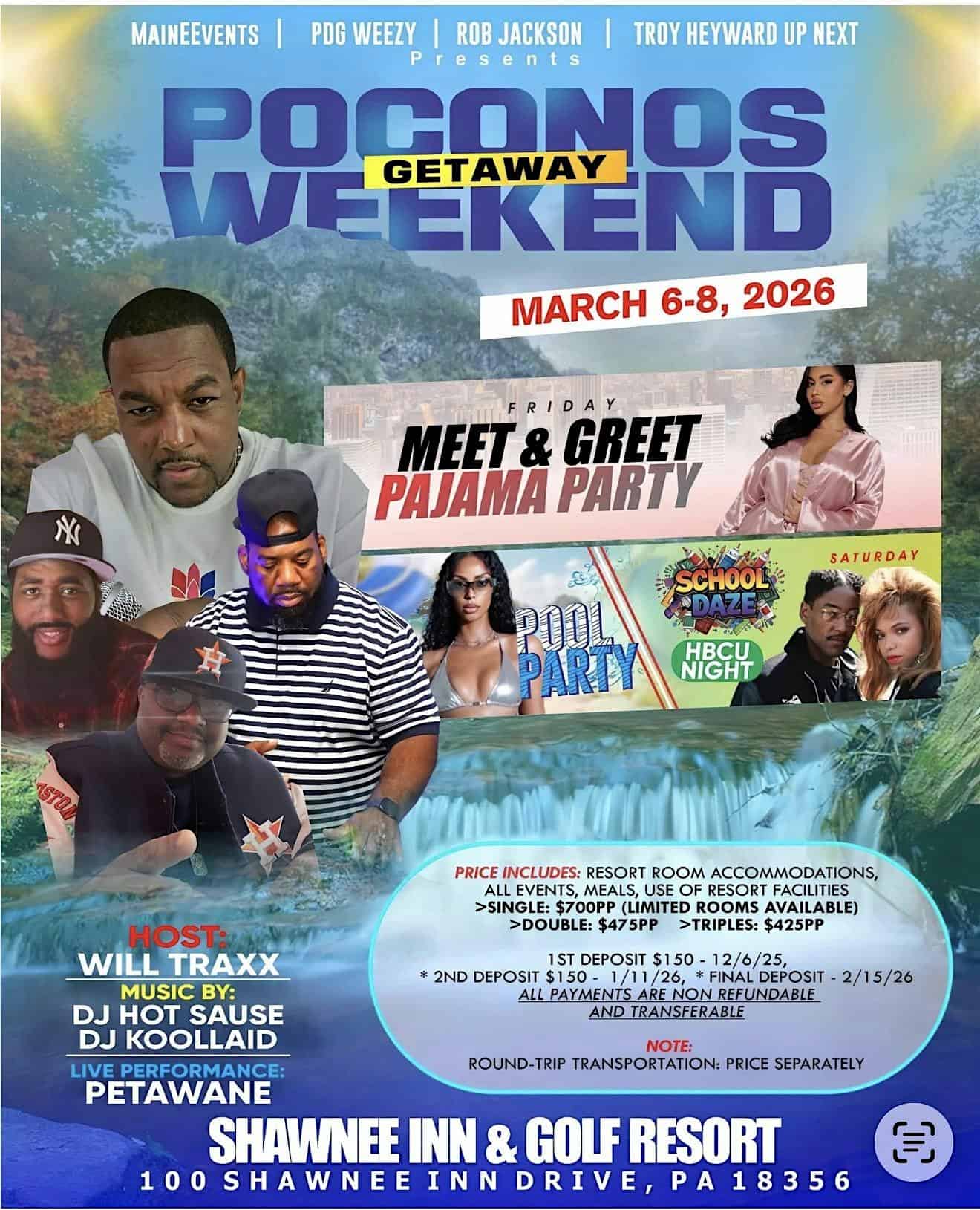 by admin23Feb Poconos Getaway Weekend at Shawnee Golf Course – Shawnee on Delaware, PA Poconos Getaway Weekend at Shawnee Golf Course – Shawnee on Delaware, PA 4 4 people viewed this event. Escape to the Poconos for a fun-filled weekend of hiking, chill vibes, and good times in nature! Tickets-RSVP Link Date And Time Friday, March 6th, 2026 @ 10:00 AM Location 100 Shawnee Inn Drive, Shawnee on Delaware, PA 18356 Event Types Film, Media & EntertainmentParty or Social Gathering Event Category Pennsylvania Share With Friends Facebook Twitter Linkedin Xing Pinterest Share This Post: