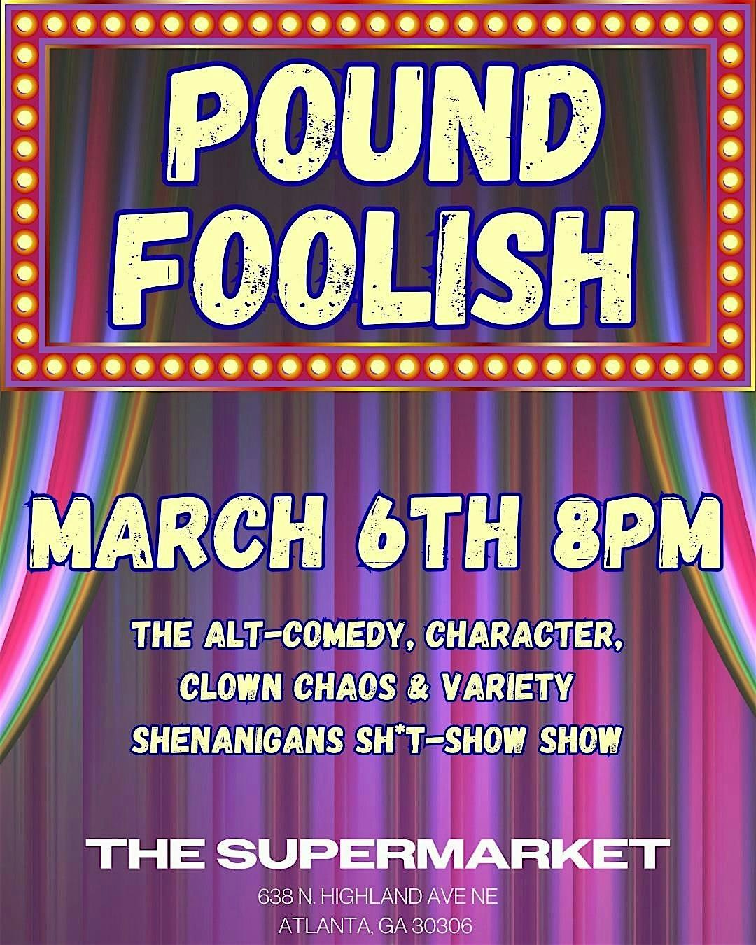 by admin05Mar Pound Foolish Variety Show at The Supermarket – Atlanta, GA Pound Foolish Variety Show at The Supermarket – Atlanta, GA 2 2 people viewed this event. Come out on Friday, March 6 at 8pm for Pound Foolish: The Variety, Alt-Comedy, Clown Chaos, & Shenanigans Sh*tShow Show! Tickets-RSVP Link Date And Time Friday, March 6th, 2026 08:00 PM (PST) Venue The Supermarket Location 638 North Highland Avenue Northeast, Atlanta, GA 30306 Event Types Concert or PerformancePerforming & Visual Arts Event Category AtlantaGeorgia Share With Friends Facebook Twitter Linkedin Xing Pinterest Share This Post: