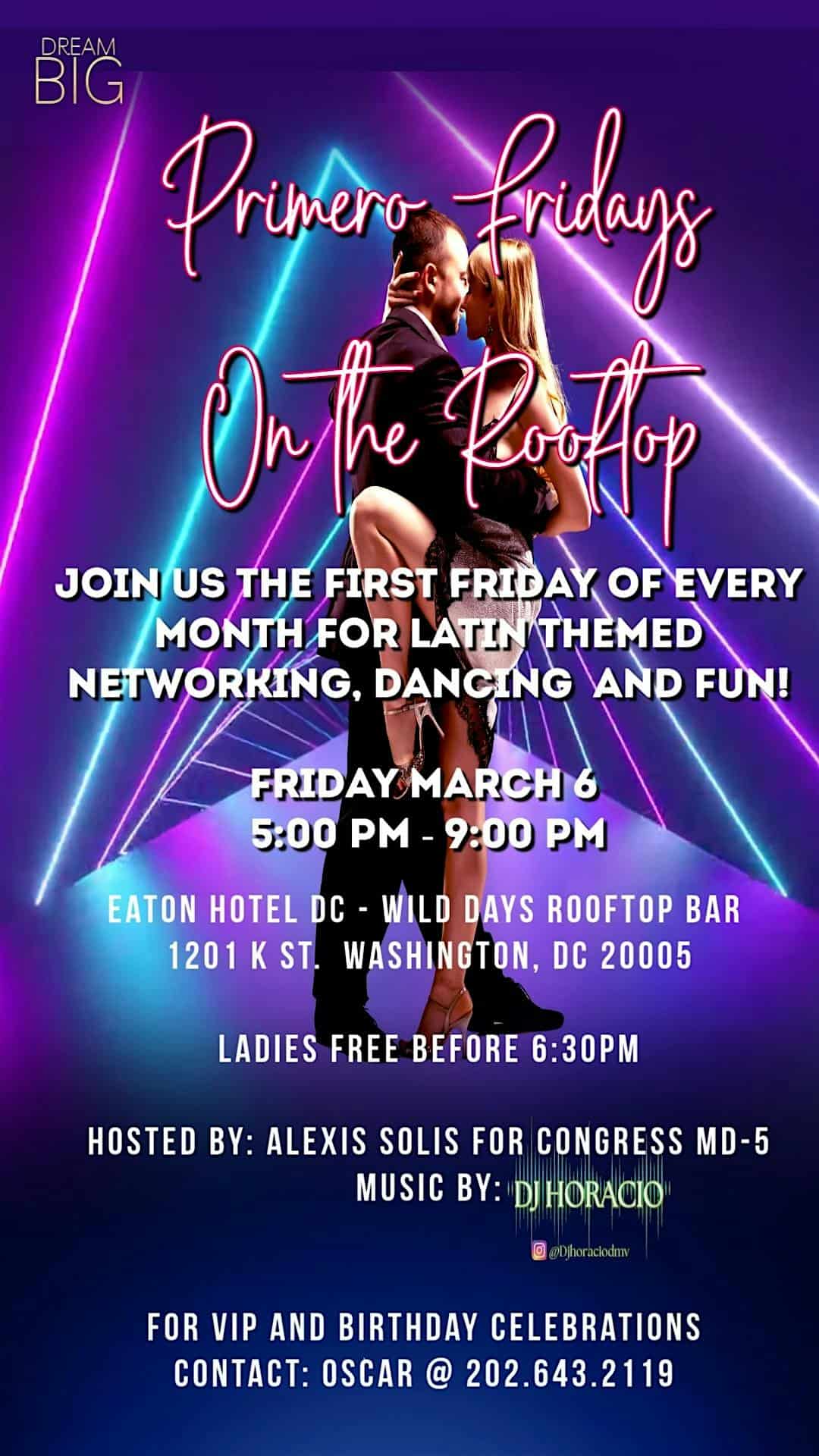 by admin23Feb Primero Fridays – Wild Days Rooftop Bar at Eaton DC – Washington, DC Primero Fridays – Wild Days Rooftop Bar at Eaton DC – Washington, DC 2 2 people viewed this event. This First Friday event is where networking meets movement to the rhythm of salsa, bachata, and merengue. Tickets-RSVP Link Date And Time Friday, March 6th, 2026 @ 05:00 PM Location 1201 K Street Northwest, Washington, DC 20005 Event Types MusicParty or Social Gathering Event Category Washington DC Share With Friends Facebook Twitter Linkedin Xing Pinterest Share This Post: