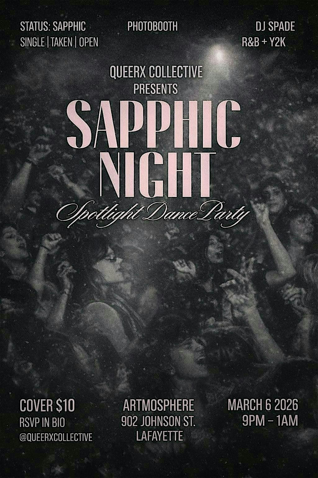 by admin23Feb QueerX Collective Sapphic Night at Artmosphere – Lafayette, LA QueerX Collective Sapphic Night at Artmosphere – Lafayette, LA 3 3 people viewed this event. Single | Taken | Open. Sapphic Night is your space for R&B, Y2K, dancing, and real connection. Tickets-RSVP Link Date And Time Friday, March 6th, 2026 @ 09:00 PM Location 902 Johnston Street, Lafayette, LA 70501 Event Types Community & CultureParty or Social Gathering Event Category Louisiana Share With Friends Facebook Twitter Linkedin Xing Pinterest Share This Post: