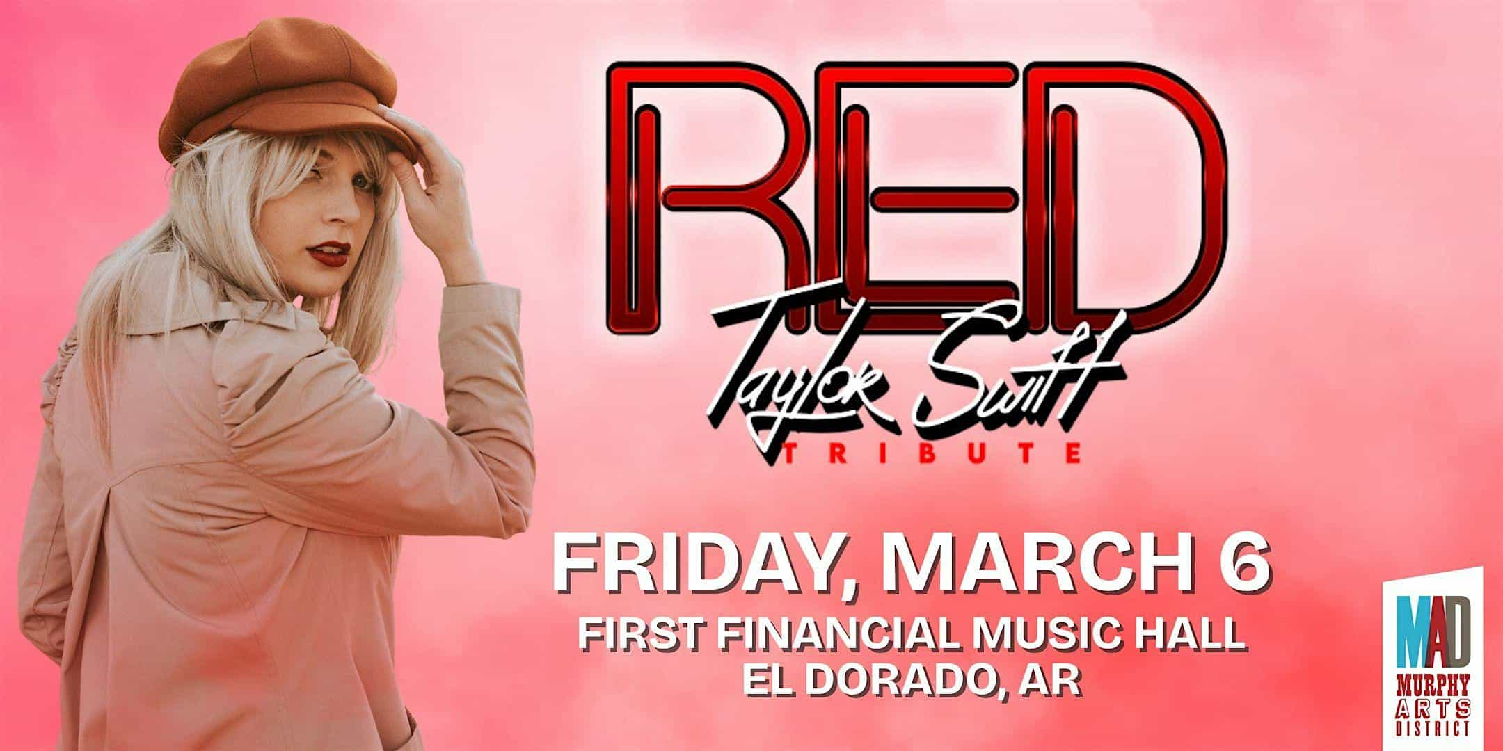 by admin23Feb Red – A Taylor Swift Tribute at First Financial Music Hall – El Dorado, AR Red – A Taylor Swift Tribute at First Financial Music Hall – El Dorado, AR 1 1 people viewed this event. Red – A Taylor Swift Tribute delivers the hits, the eras, and the energy in a family-friendly, concert-style experience. Tickets-RSVP Link Date And Time Friday, March 6th, 2026 07:00 PM (PST) Venue First Financial Music Hall Location 101 East Locust Street, El Dorado, AR 71730 Event Types Concert or PerformanceMusic Event Category Arkansas Share With Friends Facebook Twitter Linkedin Xing Pinterest Share This Post:
