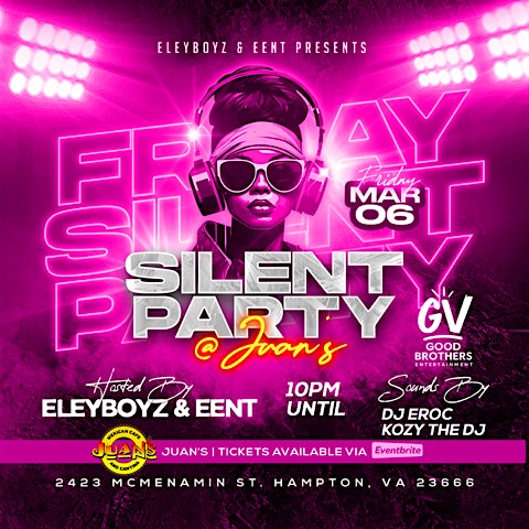 by admin27Feb Silent Party @ Juan’s at Juan’s Mexican Cafe and Cantina – Hampton, VA Silent Party @ Juan’s at Juan’s Mexican Cafe and Cantina – Hampton, VA 1 1 people viewed this event. Get ready for the ultimate Silent Party experience at Juan’s in Hampton, VA! Tickets-RSVP Link Date And Time Friday, March 6th, 2026 10:00 PM (PST) Venue Juan's Mexican Cafe and Cantina Location 2423 McMenamin Street, Hampton, VA 23666 Event Types Community & CultureParty or Social Gathering Event Category Virginia Share With Friends Facebook Twitter Linkedin Xing Pinterest Share This Post: