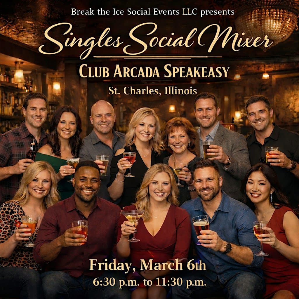 by admin23Feb Singles Social Mixer St. Charles, IL Club Arcada Speakeasy (3rd floor) at Club Arcada Speakeasy & Restaurant – St. Charles, IL Singles Social Mixer St. Charles, IL Club Arcada Speakeasy (3rd floor) at Club Arcada Speakeasy & Restaurant – St. Charles, IL 2 2 people viewed this event. We have reserved The Gatsby Den which holds up to 18 people. Reservation is 6:30pm Entertainment is 8:30pm-11:30pm Tickets-RSVP Link Date And Time Friday, March 6th, 2026 @ 06:00 PM Location 105 East Main Street, St. Charles, IL 60174 Event Types Food & DrinkParty or Social Gathering Event Category Illinois Share With Friends Facebook Twitter Linkedin Xing Pinterest Share This Post: