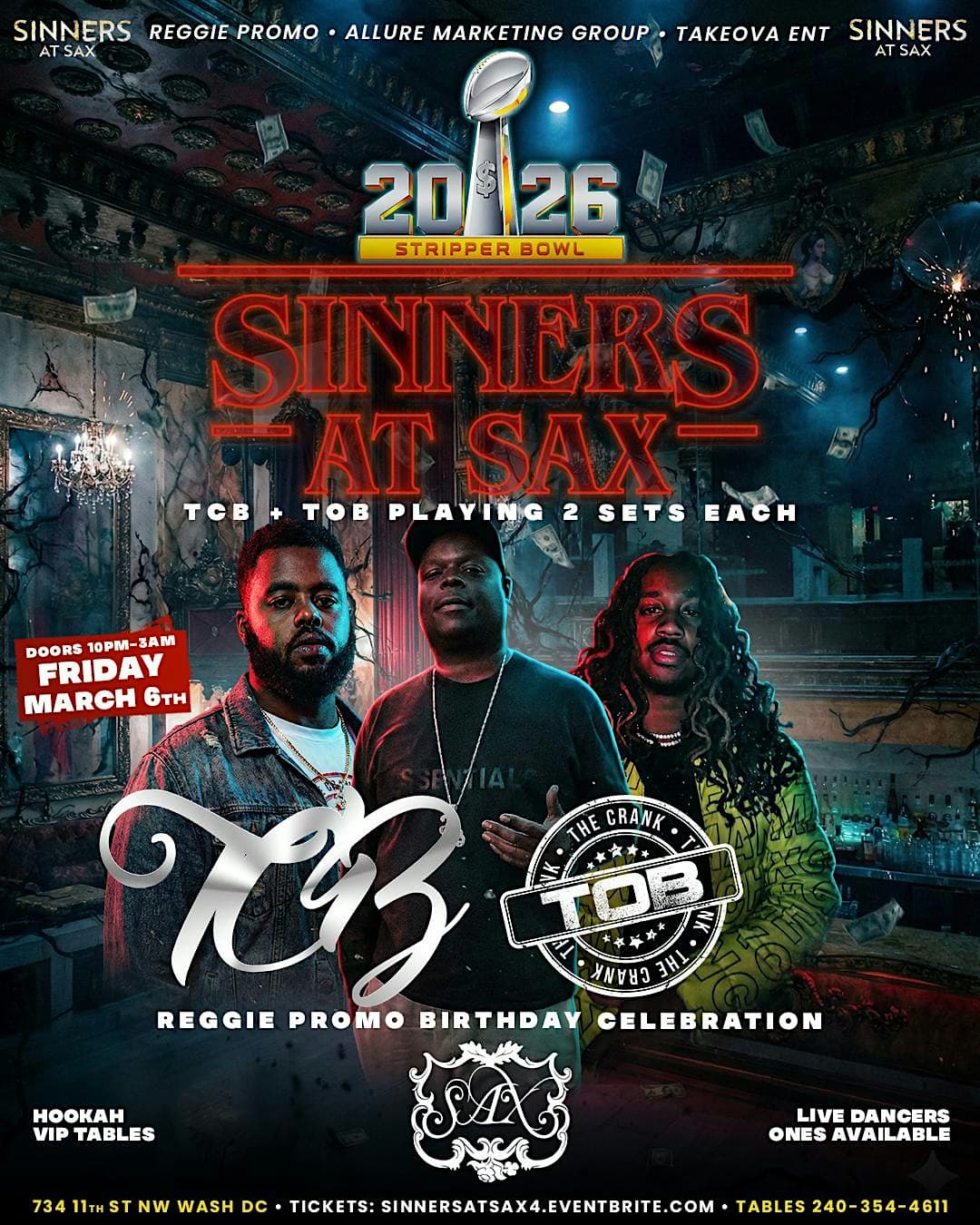 by admin23Feb SINNERS AT SAX:: STRIPPER BOWL PART 2 w/ TCB + TOB at Sax Restaurant & Lounge – Washington, DC SINNERS AT SAX:: STRIPPER BOWL PART 2 w/ TCB + TOB at Sax Restaurant & Lounge – Washington, DC 2 2 people viewed this event. TCB + TOB play 2 sets each, live dancers, and the party runs until 3AM. Reggie Promo Birthday Celebration Tickets-RSVP Link Date And Time Friday, March 6th, 2026 10:00 PM (PST) Venue Sax Restaurant & Lounge Location 734 11th Street Northwest, Washington, DC 20001 Event Types Concert or PerformanceMusic Event Category Washington DC Share With Friends Facebook Twitter Linkedin Xing Pinterest Share This Post: