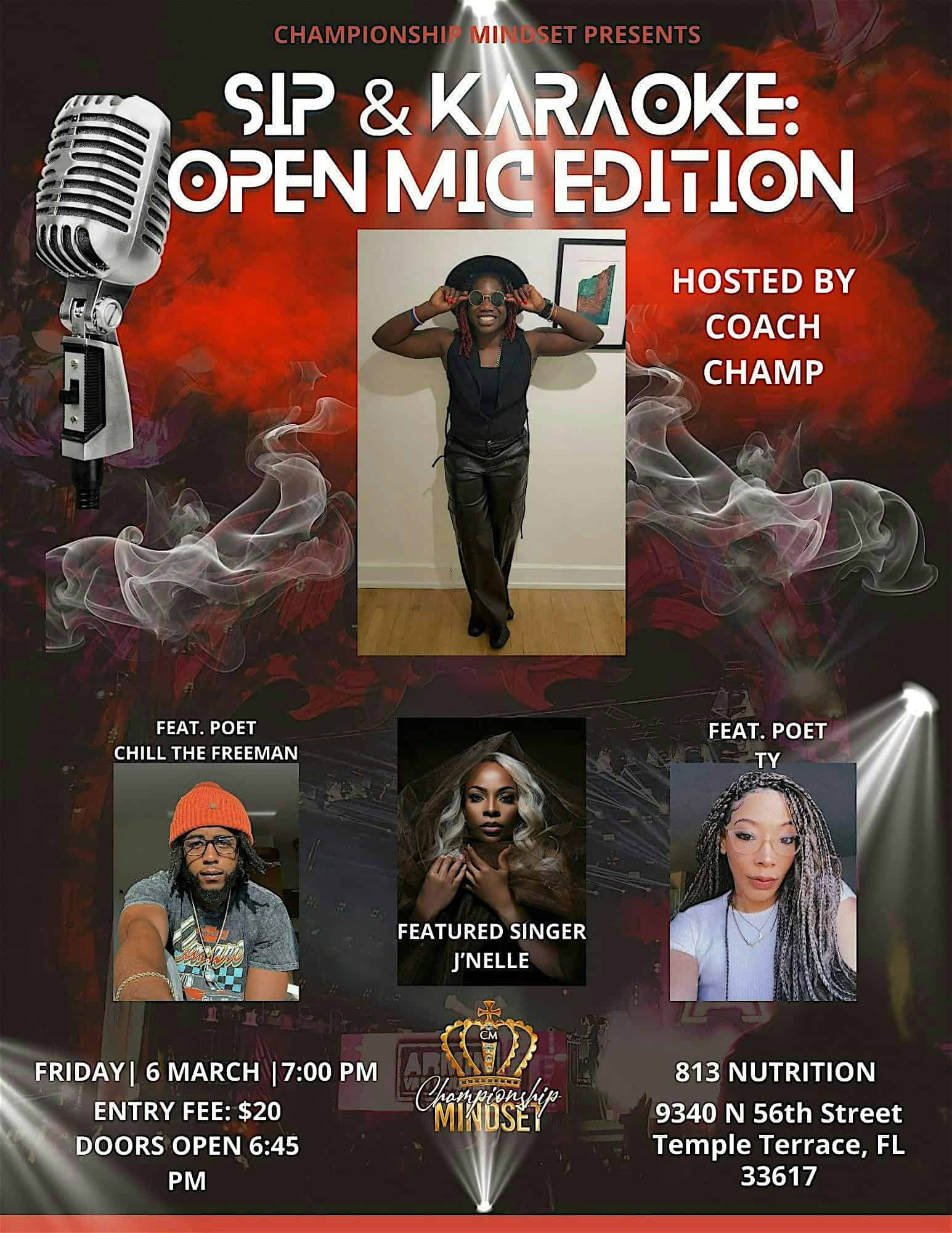 by admin23Feb Sip & Karaoke: Open Mic Edition at 9340 N 56th St suite 222 – Tampa, FL Sip & Karaoke: Open Mic Edition at 9340 N 56th St suite 222 – Tampa, FL 2 2 people viewed this event. Sip & Karaoke: Open Mic Edition — vocals, vibes, spoken word, good drinks, good people, and unforgettable energy all night. Tickets-RSVP Link Date And Time Friday, March 6th, 2026 07:00 PM (PST) Venue 9340 N 56th St suite 222 Location 9340 North 56th Street, Tampa, FL 33617 Event Types MusicParty or Social Gathering Event Category FloridaTampa Share With Friends Facebook Twitter Linkedin Xing Pinterest Share This Post: