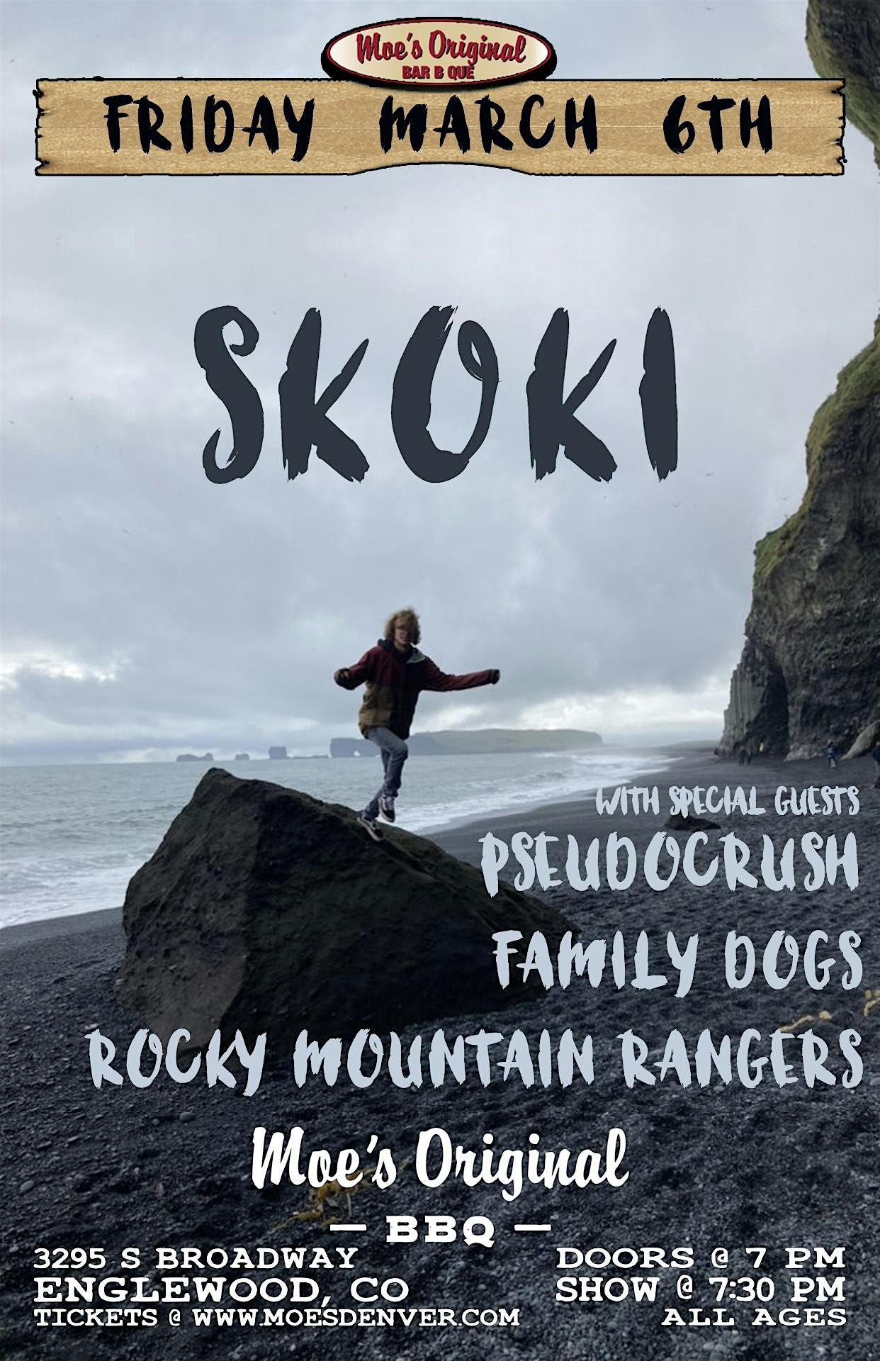 by admin27Feb Skoki w/ Pseudocrush + Family Dogs + Josh Keith &The Rocky Mountain Rangers at Moe’s Original BBQ and Bowl – Englewood, CO Skoki w/ Pseudocrush + Family Dogs + Josh Keith &The Rocky Mountain Rangers at Moe’s Original BBQ and Bowl – Englewood, CO 1 1 people viewed this event. Skoki w/ Pseudocrush + Family Dogs + Josh Keith & The Rocky Mountain Rangers Tickets-RSVP Link Date And Time Friday, March 6th, 2026 07:00 PM (PST) Venue Moe's Original BBQ and Bowl Location 3295 S Broadway, Englewood, CO 80113 Event Types Concert or PerformanceMusic Event Category ColoradoDenver Share With Friends Facebook Twitter Linkedin Xing Pinterest Share This Post: