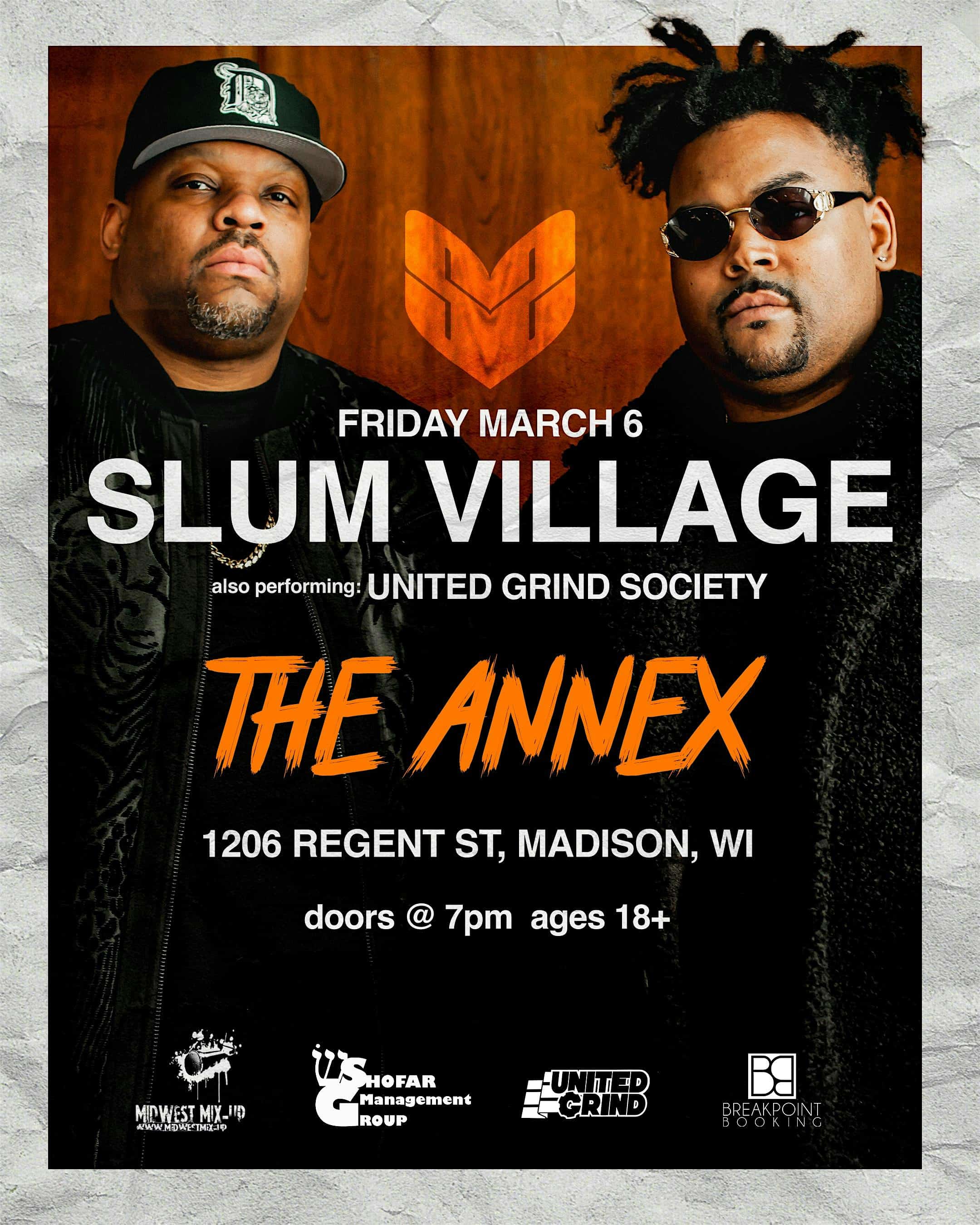 by admin23Feb Slum Village, United Grind Society, Antiii – Gravity & More at The Annex – Madison, WI Slum Village, United Grind Society, Antiii – Gravity & More at The Annex – Madison, WI 1 1 people viewed this event. Slum Village at The Annex! Tickets-RSVP Link Date And Time Friday, March 6th, 2026 07:00 PM (PST) Venue The Annex Location 1206 Regent St, Madison, WI 53715 Event Types Concert or PerformanceMusic Event Category Wisconsin Share With Friends Facebook Twitter Linkedin Xing Pinterest Share This Post: