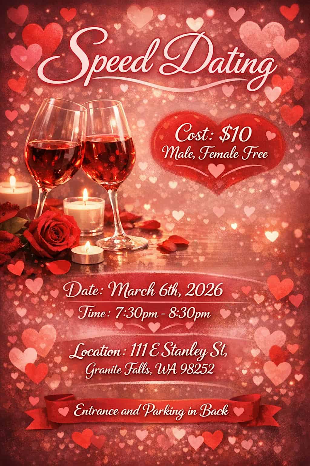 by admin23Feb Speed dating at 111 E Stanley St – Granite Falls, WA Speed dating at 111 E Stanley St – Granite Falls, WA 1 1 people viewed this event. Meet new people fast and fun—quick chats to spark connections face-to-face! Tickets-RSVP Link Date And Time Friday, March 6th, 2026 @ 07:00 PM Location 111 East Stanley Street, Granite Falls, WA 98252 Event Types Community & CultureParty or Social Gathering Event Category Washington Share With Friends Facebook Twitter Linkedin Xing Pinterest Share This Post: