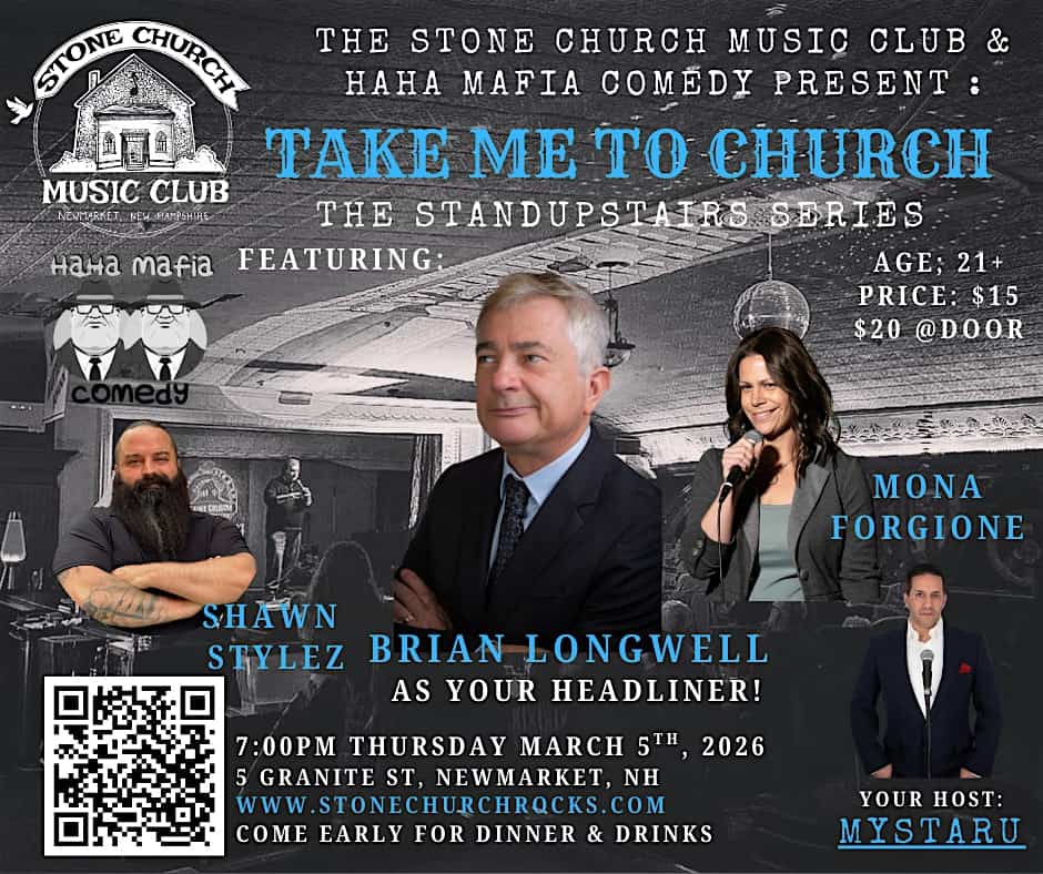by admin14Feb Take Me to Church StandupStairs Comedy Series Thursday March 5th 7pm Show at The Stone Church Music Club – Newmarket, NH Take Me to Church StandupStairs Comedy Series Thursday March 5th 7pm Show at The Stone Church Music Club – Newmarket, NH 1 1 people viewed this event. Get ready to laugh out loud at Take Me to Church StandupStairs this Thursday at 7pm—don’t miss the fun live! Tickets-RSVP Link Date And Time Friday, March 6th, 2026 12:00 AM (PST) Venue The Stone Church Music Club Location 5 Granite Street, Newmarket, NH 3857 Event Types Concert or PerformancePerforming & Visual Arts Event Category New Hampshire Share With Friends Facebook Twitter Linkedin Xing Pinterest Share This Post: