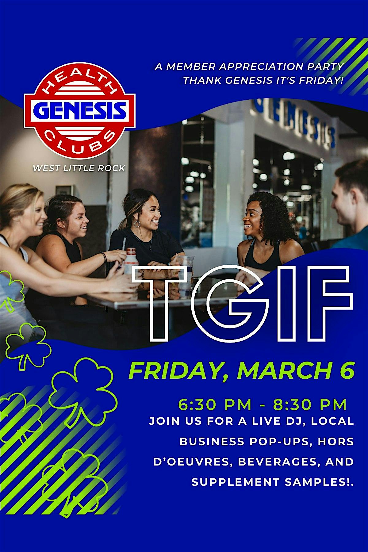 by admin27Feb Thank Genesis It’s Friday! at Genesis Health Clubs – Little Rock, AR Thank Genesis It’s Friday! at Genesis Health Clubs – Little Rock, AR 4 4 people viewed this event. Let us celebrate YOU, the best part of Genesis Health Clubs! The ultimate hangout complete with a DJ, drinks, and a party! Tickets-RSVP Link Date And Time Friday, March 6th, 2026 @ 06:00 PM Location 11700 Chenal Parkway, Little Rock, AR 72211 Event Types Party or Social GatheringSports & Fitness Event Category ArkansasLittle Rock Share With Friends Facebook Twitter Linkedin Xing Pinterest Share This Post: