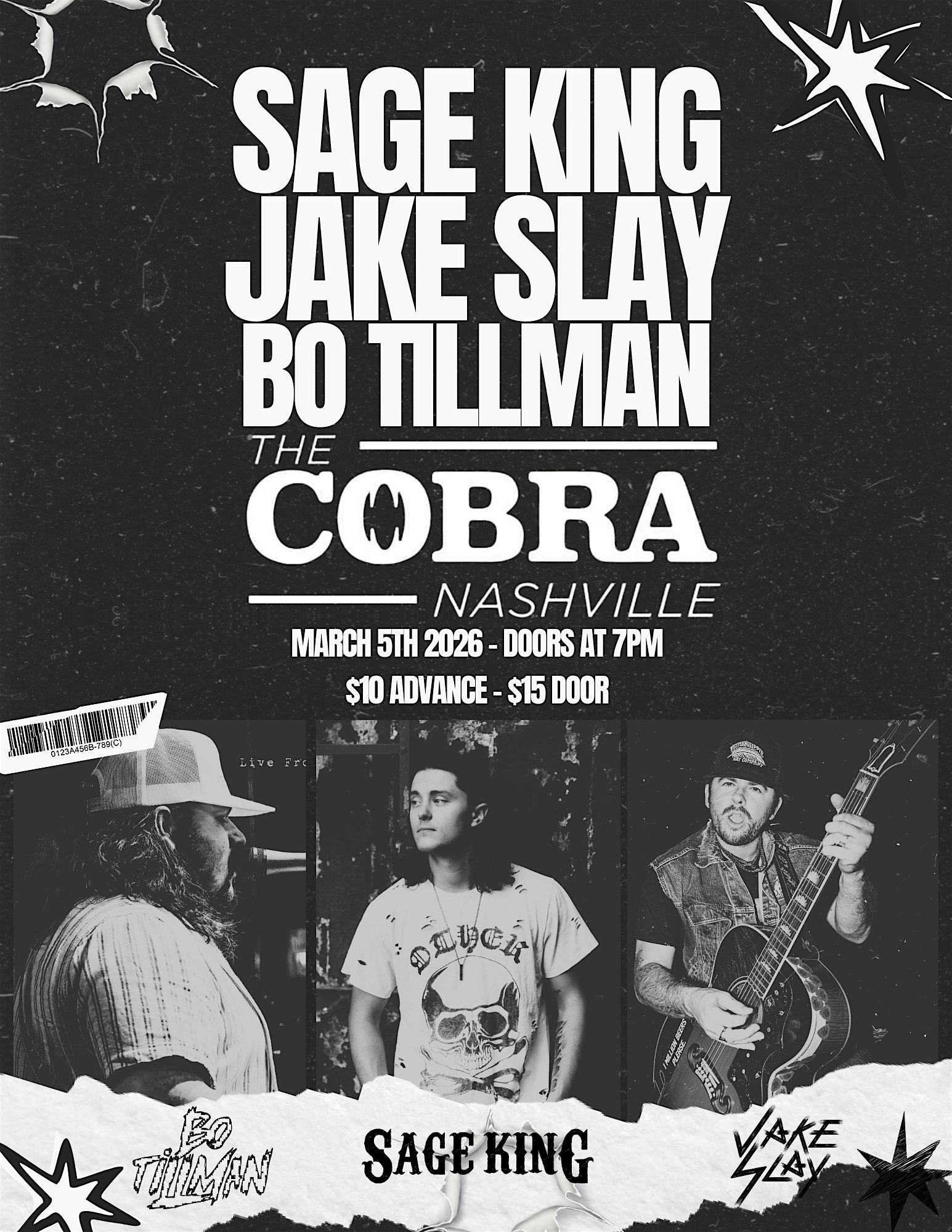 by admin13Feb Venue: Sage King | Jake Slay | Bo Tillman at Cobra Nashville – Nashville, TN Venue: Sage King | Jake Slay | Bo Tillman at Cobra Nashville – Nashville, TN 2 2 people viewed this event. 18 and UP + Tickets-RSVP Link Date And Time Friday, March 6th, 2026 01:00 AM (PST) Venue Cobra Nashville Location 2511 Gallatin Avenue, Nashville, TN 37206 Event Types Concert or PerformanceMusic Event Category NashvilleTennessee Share With Friends Facebook Twitter Linkedin Xing Pinterest Share This Post: