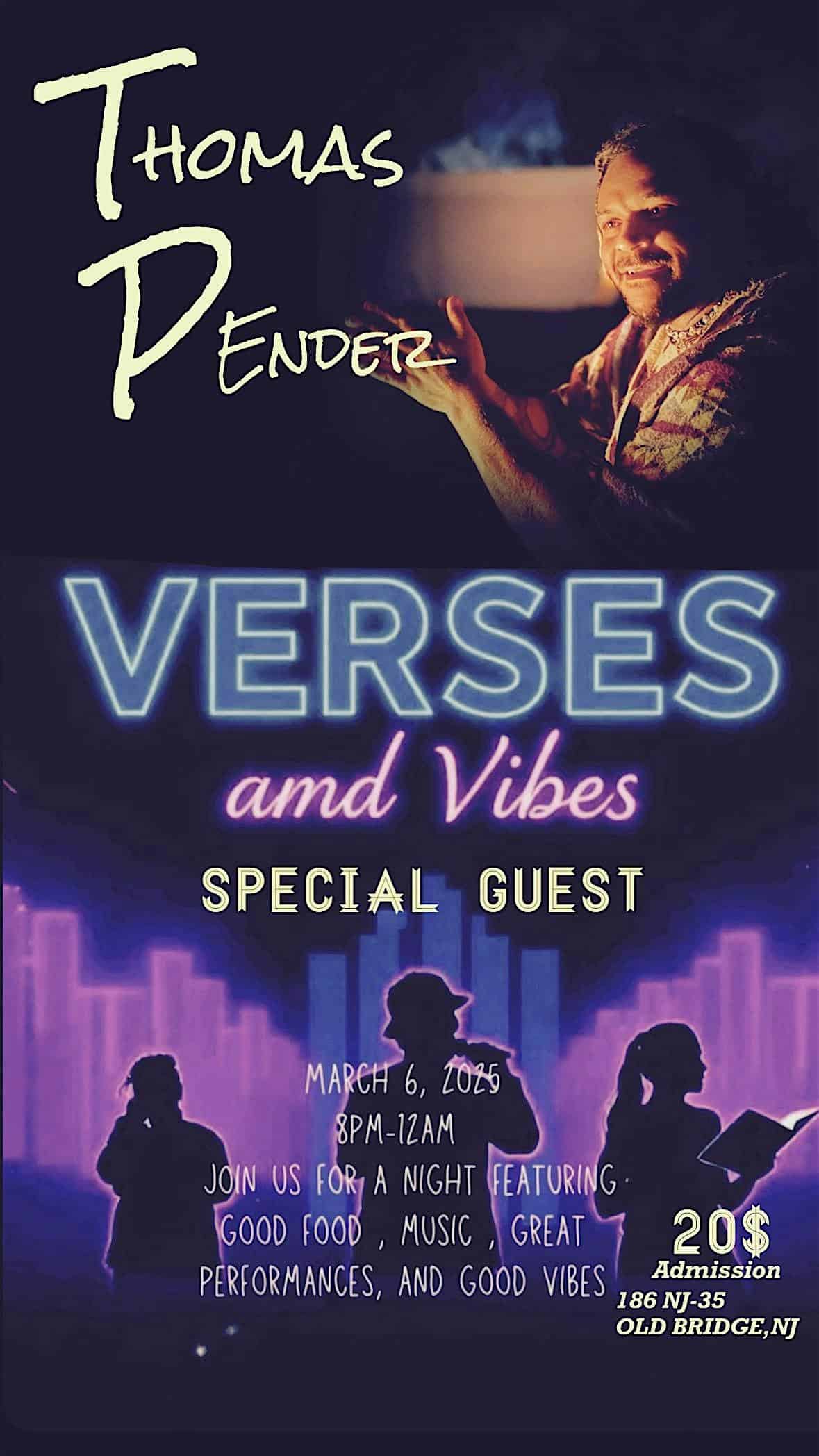 by admin23Feb Verses and Vibes at 186 NJ-35 – Keyport, NJ Verses and Vibes at 186 NJ-35 – Keyport, NJ 1 1 people viewed this event. “Vibez and Verses” Poetry, open mic and live music gonna be a blast..save the date march 6 2026. Tickets-RSVP Link Date And Time Friday, March 6th, 2026 08:00 PM (PST) Venue 186 NJ-35 Location 186 New Jersey 35, Keyport, NJ 7735 Event Types Concert or PerformanceMusic Event Category New Jersey Share With Friends Facebook Twitter Linkedin Xing Pinterest Share This Post: