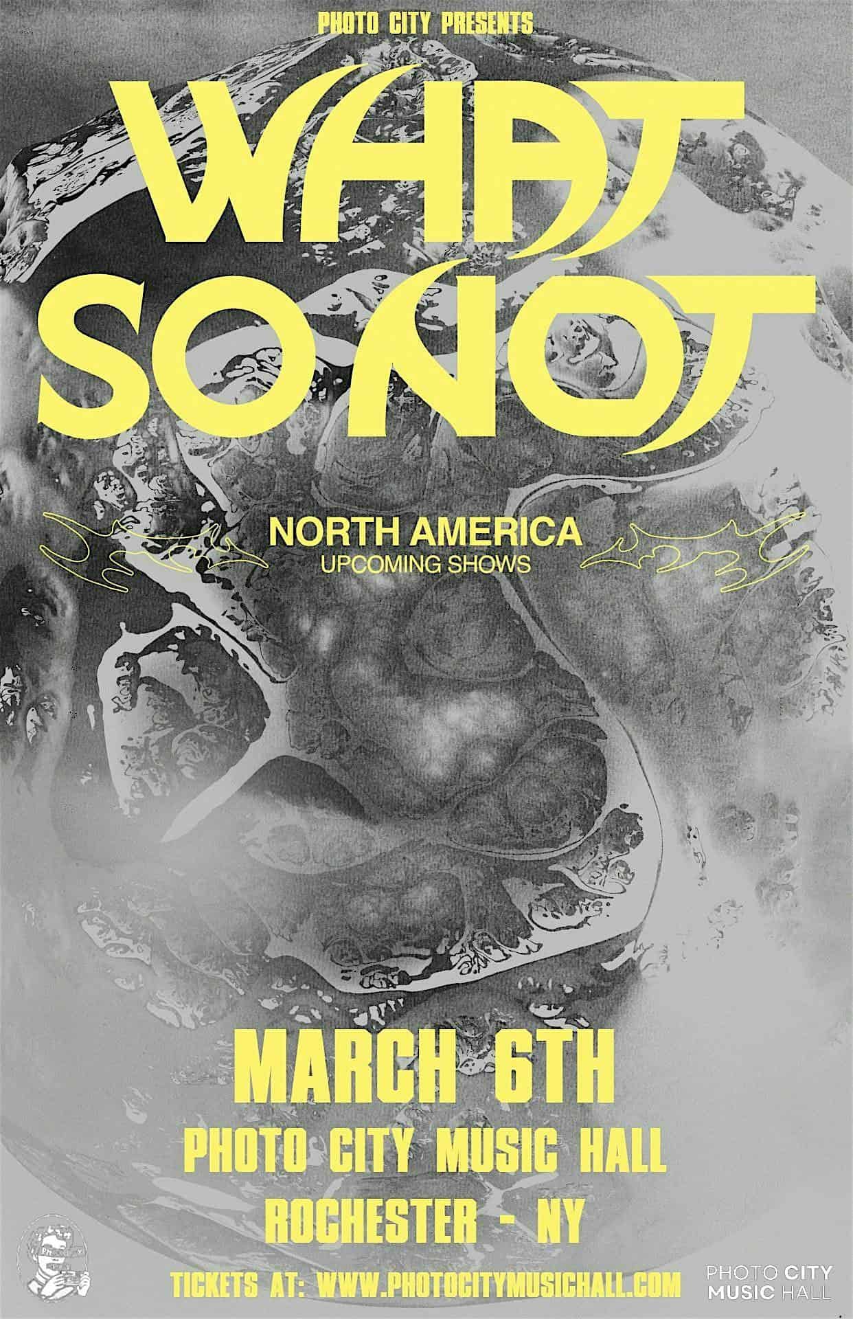 by admin23Feb What So Not – Rochester, NY at Photo City Music Hall – Rochester, NY What So Not – Rochester, NY at Photo City Music Hall – Rochester, NY 1 1 people viewed this event. What So Not performing live @ Photo City Music Hall in Rochester, NY Tickets-RSVP Link Date And Time Friday, March 6th, 2026 07:00 PM (PST) Venue Photo City Music Hall Location 543 Atlantic ave, Rochester, NY 14609 Event Types Concert or PerformanceMusic Event Category New York Share With Friends Facebook Twitter Linkedin Xing Pinterest Share This Post: