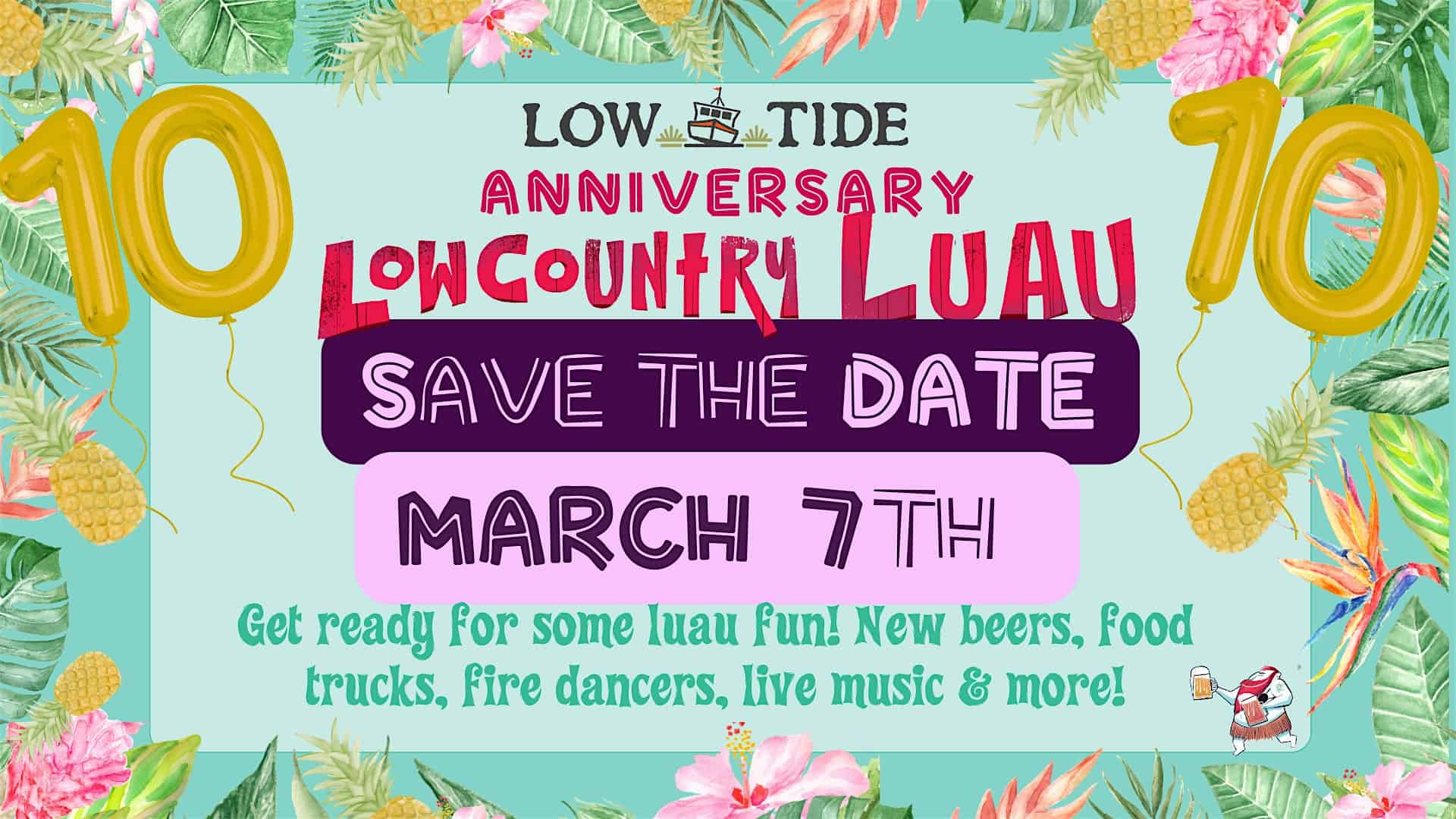 by admin23Feb 10th Anniversary Lowcountry Luau at Low Tide Brewing – Johns Island, SC 10th Anniversary Lowcountry Luau at Low Tide Brewing – Johns Island, SC 2 2 people viewed this event. Aloha! The Tiki Gods have spoken and request your presence on Saturday, March 7th, 2026 starting at 12pm. Tickets-RSVP Link Date And Time Saturday, March 7th, 2026 @ 12:00 PM Location 2863 Maybank Highway, Johns Island, SC 29455 Event Types Community & CultureParty or Social Gathering Event Category South Carolina Share With Friends Facebook Twitter Linkedin Xing Pinterest Share This Post: