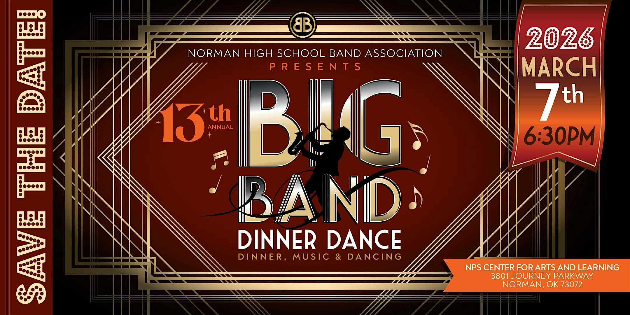 by admin23Feb 13th Annual Big Band Dinner Dance, Benefitting the Norman High School Band at 3801 Journey Pkwy – Norman, OK 13th Annual Big Band Dinner Dance, Benefitting the Norman High School Band at 3801 Journey Pkwy – Norman, OK 2 2 people viewed this event. A night of dinner, music, and dancing benefitting the band programs at Norman High School. Tickets-RSVP Link Date And Time Saturday, March 7th, 2026 06:00 PM (PST) Venue 3801 Journey Pkwy Location 3801 Journey Parkway, Norman, OK 73072 Event Types Concert or PerformanceMusic Event Category OklahomaOklahoma City Share With Friends Facebook Twitter Linkedin Xing Pinterest Share This Post: