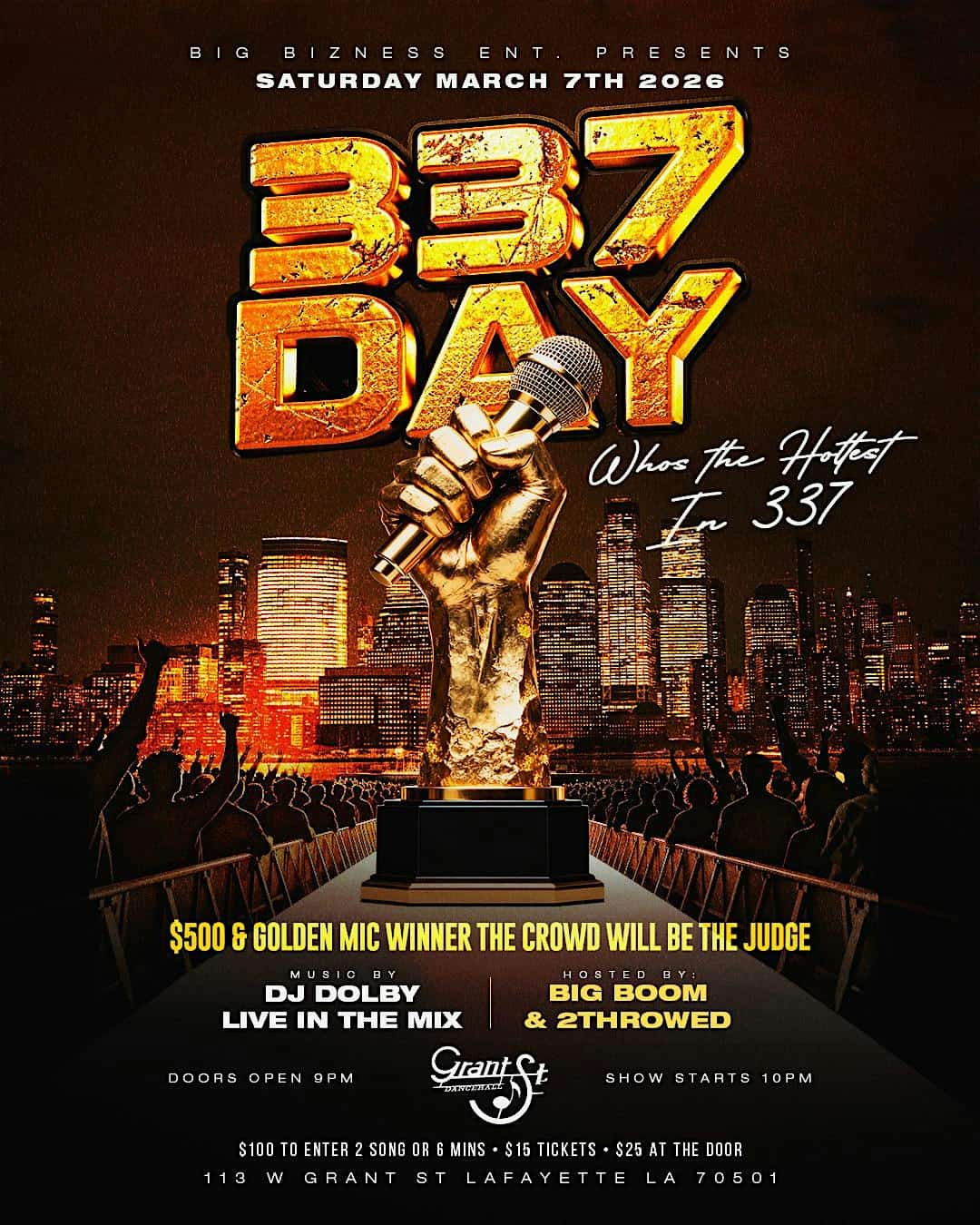by admin23Feb 337 DAY at 113 N Grant St – Lafayette, LA 337 DAY at 113 N Grant St – Lafayette, LA 2 2 people viewed this event. Big Bizness Presents 337 Day 2026! Join us as we celebrate local talent and culture. Tickets-RSVP Link Date And Time Saturday, March 7th, 2026 08:00 PM (PST) Venue 113 N Grant St Location 113 North Grant Street, Lafayette, LA 70501 Event Types Concert or PerformanceMusic Event Category Louisiana Share With Friends Facebook Twitter Linkedin Xing Pinterest Share This Post:
