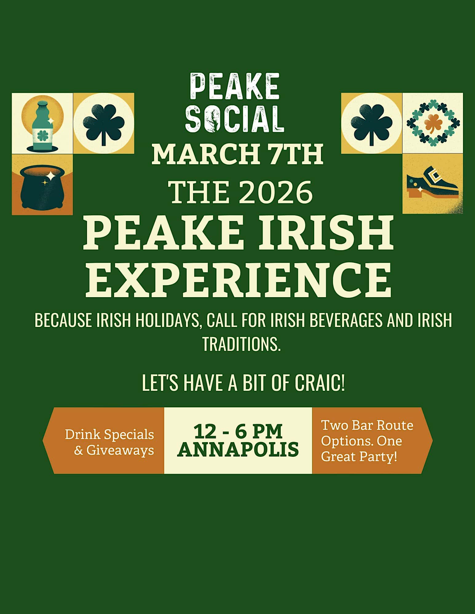 by admin23Feb 4th Annual Peake Irish Experience for Annapolis St Patrick’s Day on 3/7 at Main Street – Annapolis, MD 4th Annual Peake Irish Experience for Annapolis St Patrick’s Day on 3/7 at Main Street – Annapolis, MD 2 2 people viewed this event. St. Patrick’s Day in Annapolis Got a Whole Lot More Irish! Authentic beer with Guinness, real Irish drinks, and two options to choose from! Tickets-RSVP Link Date And Time Saturday, March 7th, 2026 @ 12:00 PM Location Main Street, Annapolis, MD 21401 Event Types Food & DrinkParty or Social Gathering Event Category Maryland Share With Friends Facebook Twitter Linkedin Xing Pinterest Share This Post: