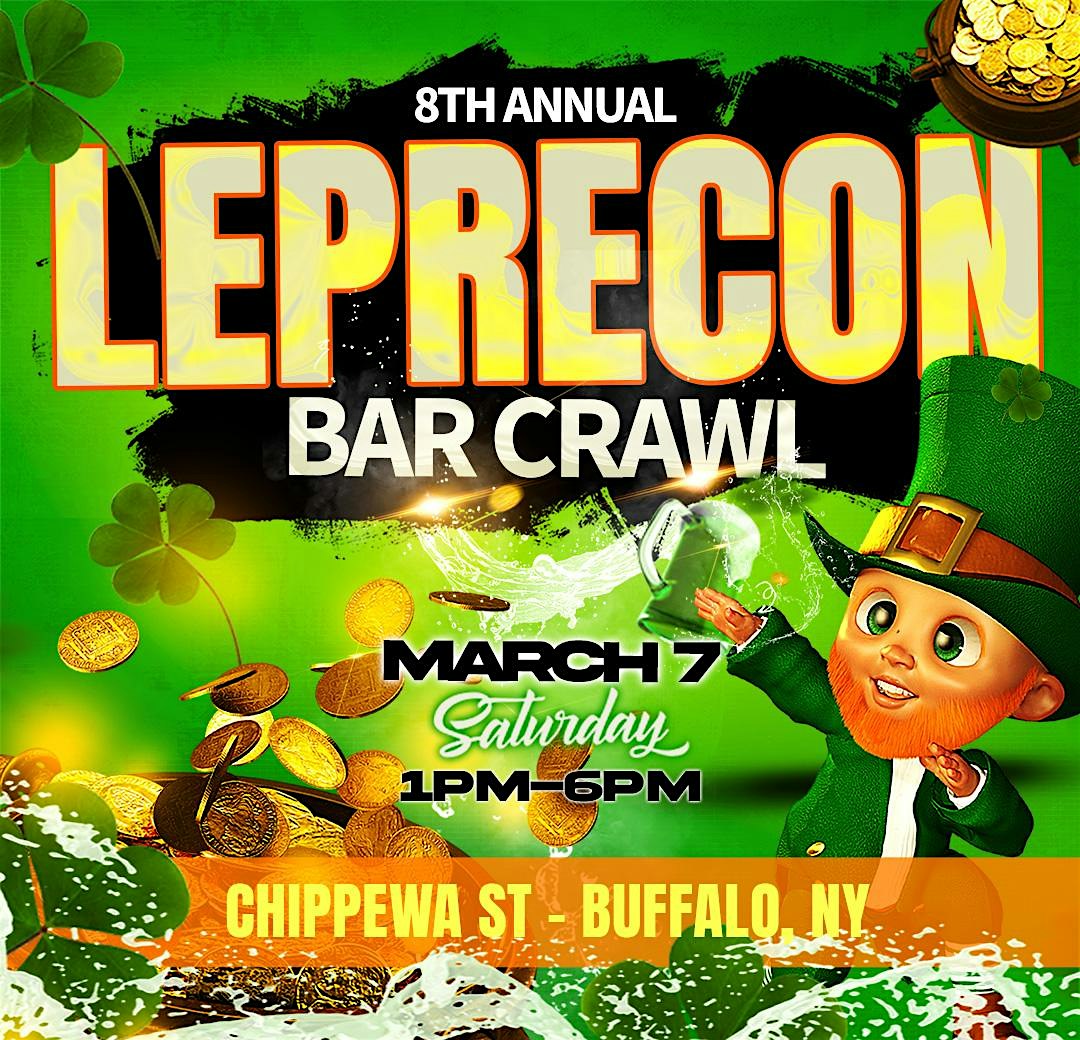 by admin13Feb 8th Annual Buffalo LepreCon Bar Crawl at Downtown Buffalo – Buffalo, NY 8th Annual Buffalo LepreCon Bar Crawl at Downtown Buffalo – Buffalo, NY 2 2 people viewed this event. The Leprecon Crawl is back for the 8th year! Tickets-RSVP Link Date And Time Saturday, March 7th, 2026 06:00 PM (PST) Venue Downtown Buffalo Location Buffalo, NY, Buffalo, NY 14203 Event Types Concert or PerformanceMusic Event Category BuffaloNew York Share With Friends Facebook Twitter Linkedin Xing Pinterest Share This Post: