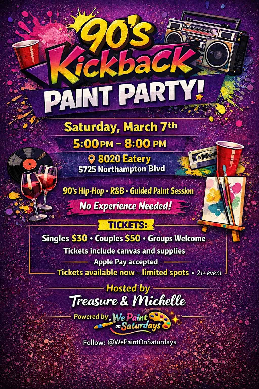 by admin14Feb 90’s Kickback Paint Party at 80/20 Eatery – Virginia Beach, VA 90’s Kickback Paint Party at 80/20 Eatery – Virginia Beach, VA 1 1 people viewed this event. “Sip, paint & vibe! Join our 90’s Kickback Paint Party with classic Hip-Hop & R&B, drinks, guided painting & chill energy. ” Tickets-RSVP Link Date And Time Saturday, March 7th, 2026 10:00 PM (PST) Venue 80/20 Eatery Location 5725 Northampton Boulevard, Virginia Beach, VA 23455 Event Types Party or Social GatheringPerforming & Visual Arts Event Category VirginiaVirginia Beach Share With Friends Facebook Twitter Linkedin Xing Pinterest Share This Post: