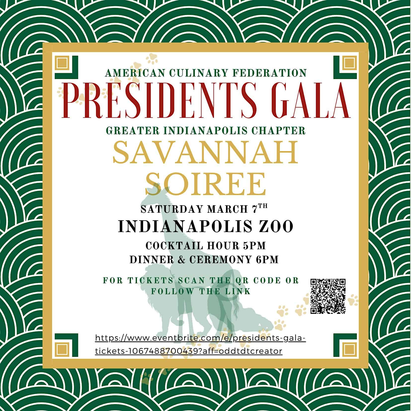 by admin14Feb ACF Indy President’s Gala Savannah Soiree at Indianapolis Zoo – Indianapolis, IN ACF Indy President’s Gala Savannah Soiree at Indianapolis Zoo – Indianapolis, IN 2 2 people viewed this event. Join us for the 56th Annual American Culinary Federation President’s Gala! Tickets-RSVP Link Date And Time Saturday, March 7th, 2026 10:00 PM (PST) Venue Indianapolis Zoo Location 1200 West Washington Street, Indianapolis, IN 46222 Event Types Food & Drink Event Category IndianaIndianapolis Share With Friends Facebook Twitter Linkedin Xing Pinterest Share This Post: