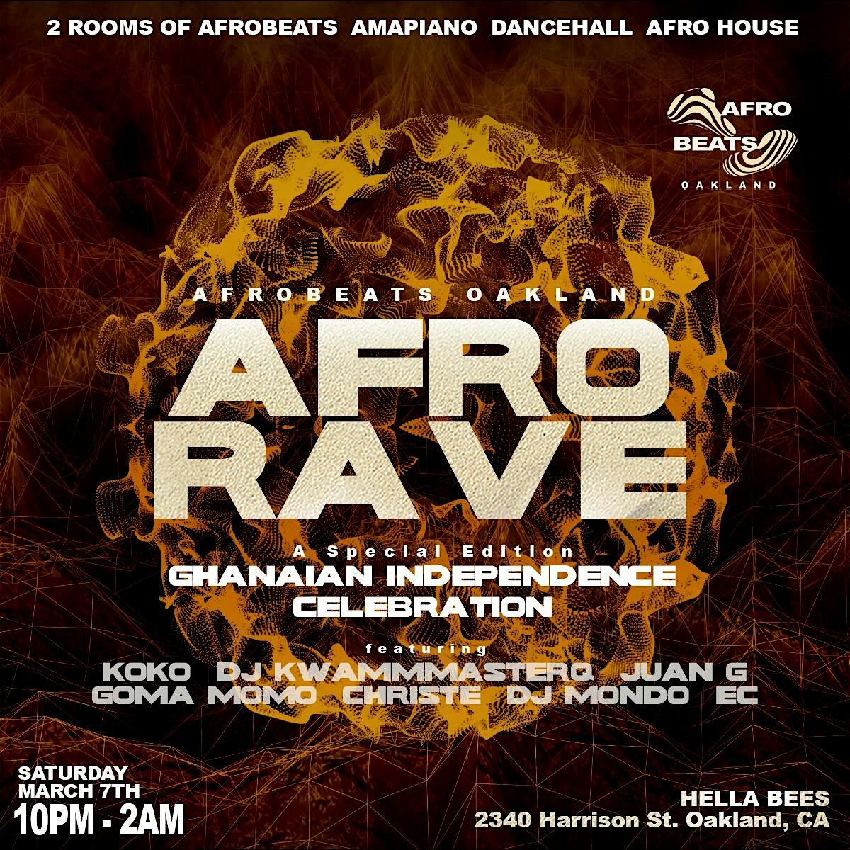 by admin27Feb AFRO RAVE 2026 Season kick off/ GH Independence! (Afrobeats Oakland) at HELLA BEES – Oakland, CA AFRO RAVE 2026 Season kick off/ GH Independence! (Afrobeats Oakland) at HELLA BEES – Oakland, CA 2 2 people viewed this event. We’re celebrating Ghanaian Independence at our official 2026 season kick off! AFRO RAVE is back! Tickets-RSVP Link Date And Time Saturday, March 7th, 2026 10:00 PM (PST) Venue HELLA BEES Location 2340 Harrison Street, Oakland, CA 94612 Event Types MusicParty or Social Gathering Event Category CaliforniaOakland Share With Friends Facebook Twitter Linkedin Xing Pinterest Share This Post: