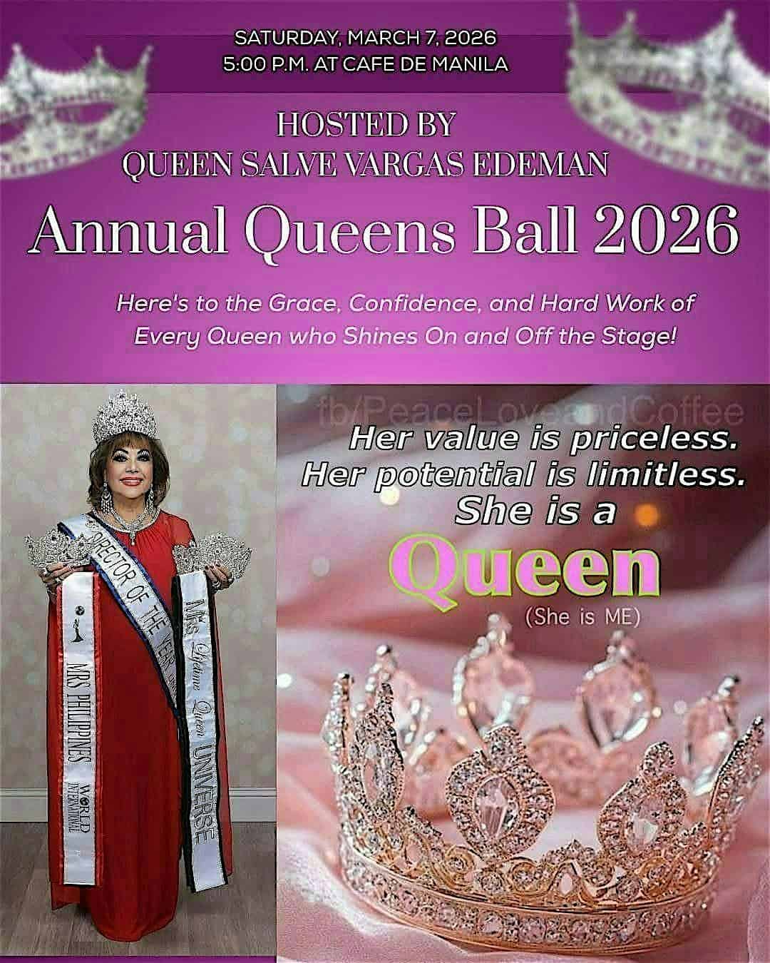 by admin23Feb ANNUAL QUEENS BALL 2026 at Cafe de Manila – Las Vegas, NV ANNUAL QUEENS BALL 2026 at Cafe de Manila – Las Vegas, NV 1 1 people viewed this event. Get ready to dazzle and dance at the Annual Queens Ball 2026—where glamour meets unforgettable fun! Tickets-RSVP Link Date And Time Saturday, March 7th, 2026 @ 05:00 PM Location 4155 South Buffalo Drive, Las Vegas, NV 89147 Event Types Community & CultureParty or Social Gathering Event Category Las VegasNevada Share With Friends Facebook Twitter Linkedin Xing Pinterest Share This Post: