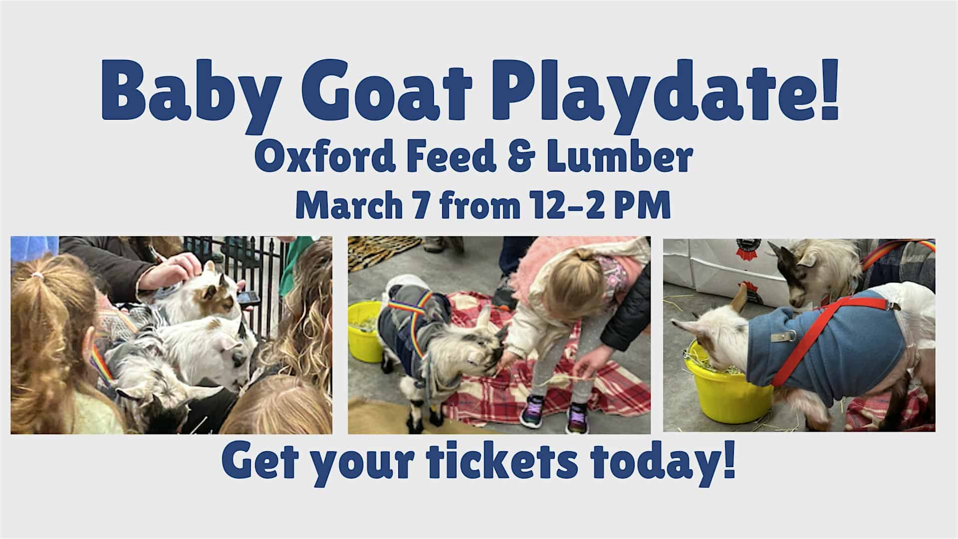 by admin23Feb Baby Goat Playdate at Oxford Feed & Lumber – Oxford, PA Baby Goat Playdate at Oxford Feed & Lumber – Oxford, PA 2 2 people viewed this event. Play with baby goats at Oxford Feed & Lumber on March 7 from 12–2 PM. $5 per person for baby goat snuggles and selfies! Tickets-RSVP Link Date And Time Saturday, March 7th, 2026 @ 12:00 PM Location 112 Railroad Ave, Oxford, PA 19363 Event Types Party or Social Gathering Event Category Pennsylvania Share With Friends Facebook Twitter Linkedin Xing Pinterest Share This Post: