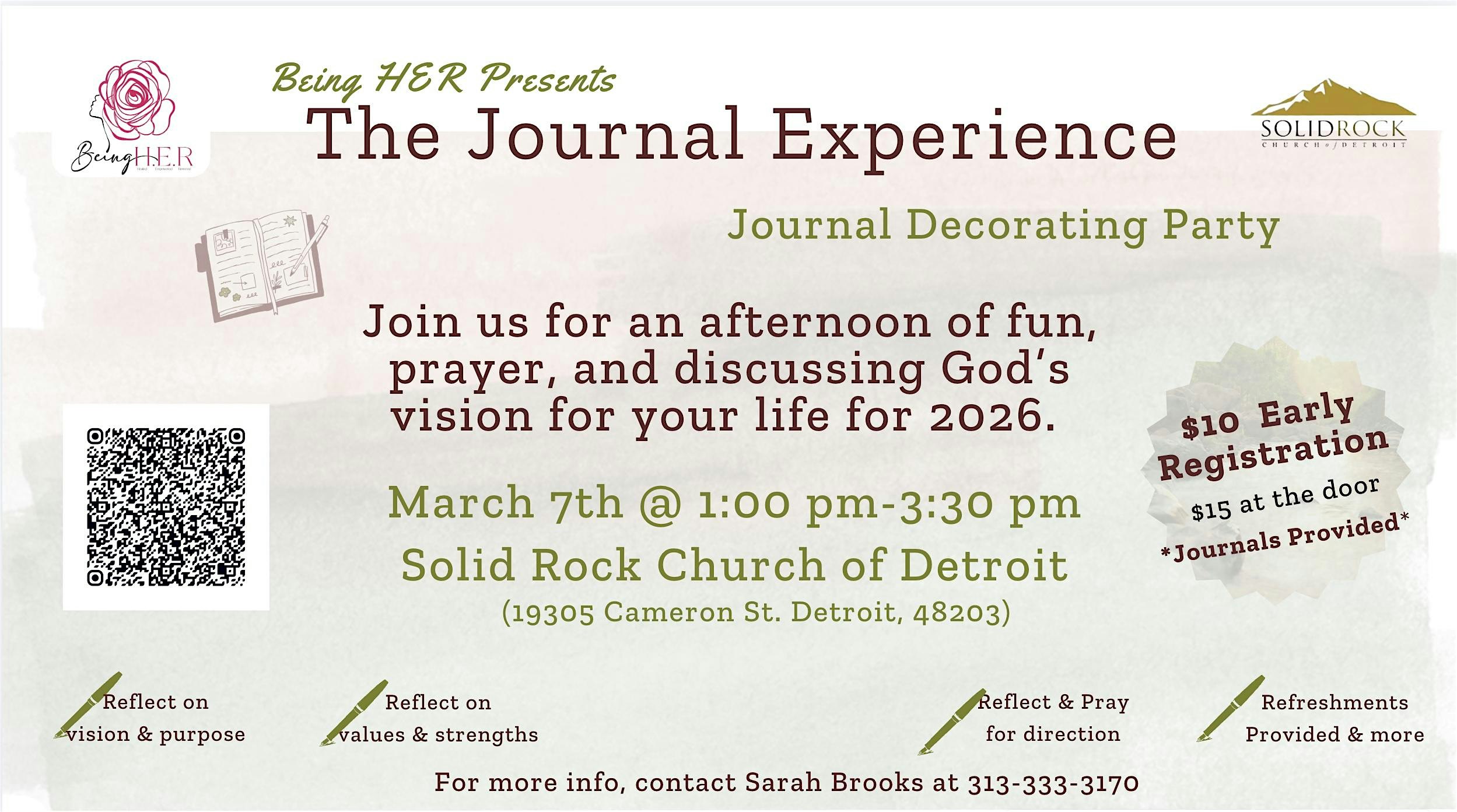by admin27Feb Being HER – The “Vision Journal” Experience at Solid Rock Church of Detroit, Cameron Street, Detroit, MI, USA – Detroit, MI Being HER – The “Vision Journal” Experience at Solid Rock Church of Detroit, Cameron Street, Detroit, MI, USA – Detroit, MI 1 1 people viewed this event. Dive into self-discovery and empowerment at Being HER – The Journal Experience, where your story comes alive! Tickets-RSVP Link Date And Time Saturday, March 7th, 2026 01:00 PM (PST) Venue Solid Rock Church of Detroit, Cameron Street, Detroit, MI, USA Location 19305 Cameron Street, Detroit, MI 48203 Event Types Community & CultureParty or Social Gathering Event Category DetroitMichigan Share With Friends Facebook Twitter Linkedin Xing Pinterest Share This Post: