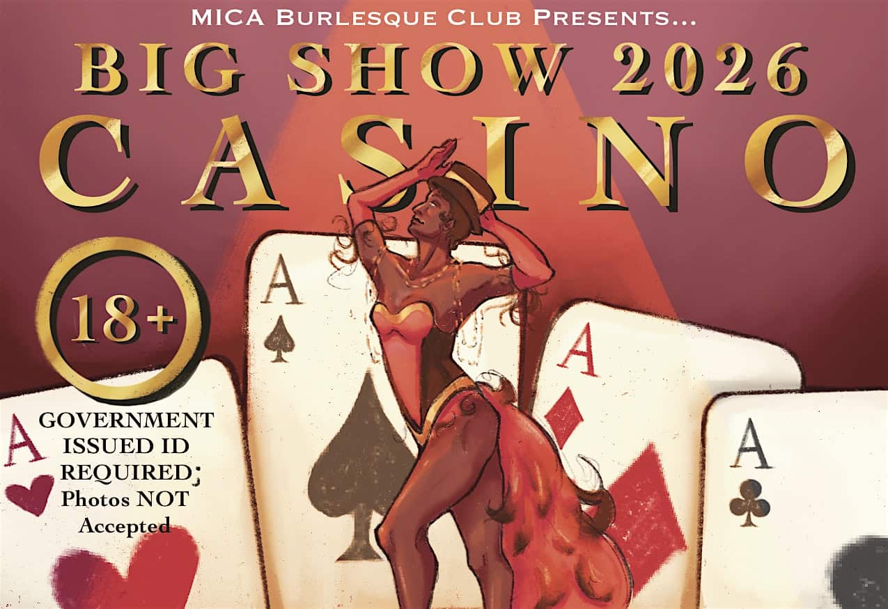 by admin23Feb Big Show 2026: Casino – Saturday, March 7th at MICA – Brown Center – Baltimore, MD Big Show 2026: Casino – Saturday, March 7th at MICA – Brown Center – Baltimore, MD 1 1 people viewed this event. Join Burlesque Club for our annual Spring Big Show! Tickets-RSVP Link Date And Time Saturday, March 7th, 2026 @ 06:00 PM Location 1301 West Mount Royal Avenue, Baltimore, MD 21217 Event Types Party or Social GatheringPerforming & Visual Arts Event Category BaltimoreMaryland Share With Friends Facebook Twitter Linkedin Xing Pinterest Share This Post:
