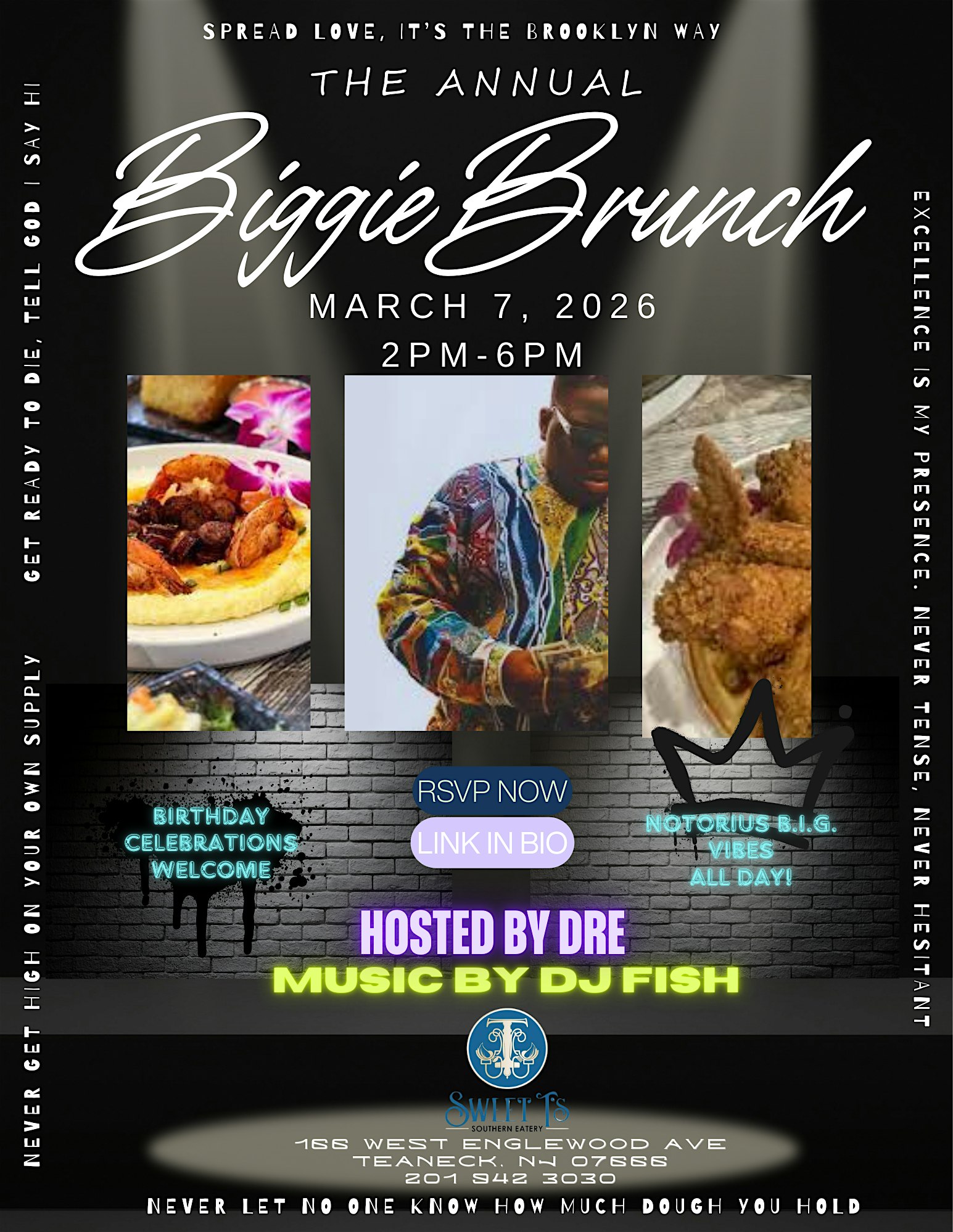 by admin23Feb BIGGIE BRUNCH at Sweet T’s Southern Eatery Restaurant and Bar – Teaneck, NJ BIGGIE BRUNCH at Sweet T’s Southern Eatery Restaurant and Bar – Teaneck, NJ 3 3 people viewed this event. Get ready to brunch like a boss at the BIGGIE BRUNCH – a legendary event serving up delicious food, banging beats, and an unforgettable vibe Tickets-RSVP Link Date And Time Saturday, March 7th, 2026 02:00 PM (PST) Venue Sweet T's Southern Eatery Restaurant and Bar Location 166 West Englewood Avenue, Teaneck, NJ 7666 Event Types Food & DrinkParty or Social Gathering Event Category New Jersey Share With Friends Facebook Twitter Linkedin Xing Pinterest Share This Post: