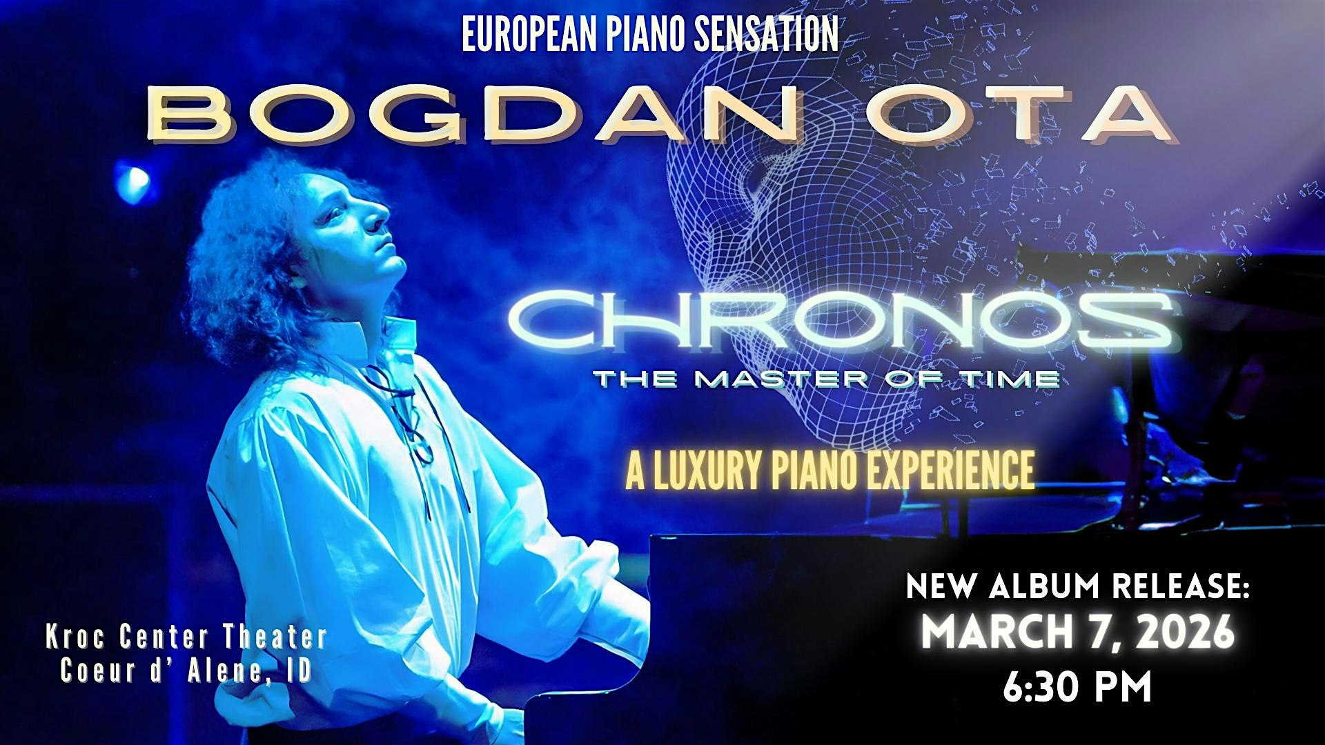 by admin27Feb Bogdan Ota: Chronos- A Luxury Piano Experience at The Salvation Army Kroc Center – Coeur d’Alene, ID Bogdan Ota: Chronos- A Luxury Piano Experience at The Salvation Army Kroc Center – Coeur d’Alene, ID 2 2 people viewed this event. Experience the power of music beyond imagination! A breathtaking fusion of piano, synthesizers, symphonic grandeur and modern sound design. Tickets-RSVP Link Date And Time Saturday, March 7th, 2026 06:00 PM (PST) Venue The Salvation Army Kroc Center Location 1765 West Golf Course Road, Coeur d'Alene, ID 83815 Event Types Concert or PerformanceMusic Event Category Idaho Share With Friends Facebook Twitter Linkedin Xing Pinterest Share This Post: