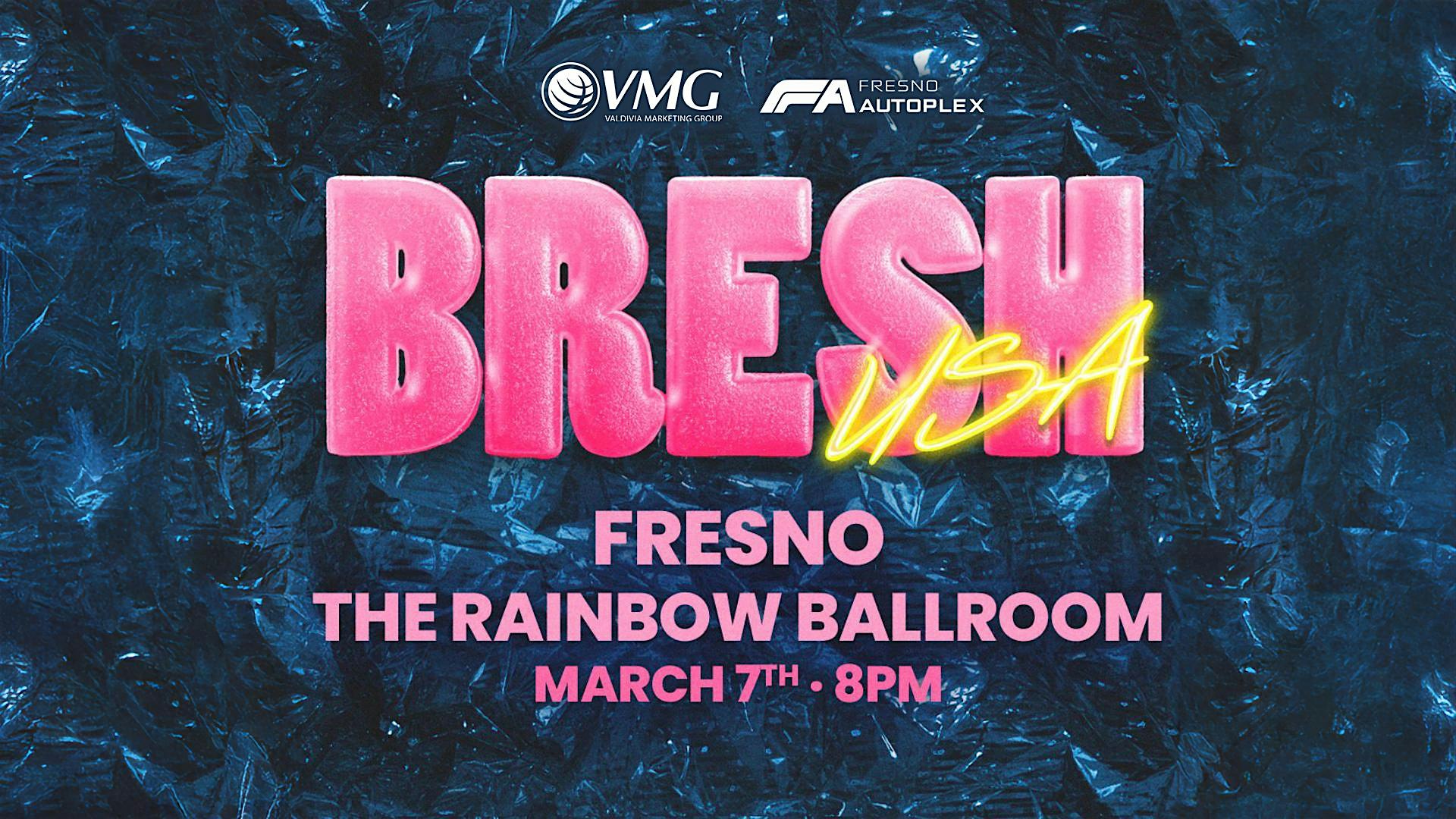 by admin23Feb BRESH – FRESNO, CA at Rainbow Ballroom – Fresno, CA BRESH – FRESNO, CA at Rainbow Ballroom – Fresno, CA 2 2 people viewed this event. THE BIGGEST LATIN PARTY ON EARTH IS IN TOWN! Tickets-RSVP Link Date And Time Saturday, March 7th, 2026 08:00 PM (PST) Venue Rainbow Ballroom Location 1725 Broadway Street, Fresno, CA 93721 Event Types Concert or PerformanceMusic Event Category California Share With Friends Facebook Twitter Linkedin Xing Pinterest Share This Post: