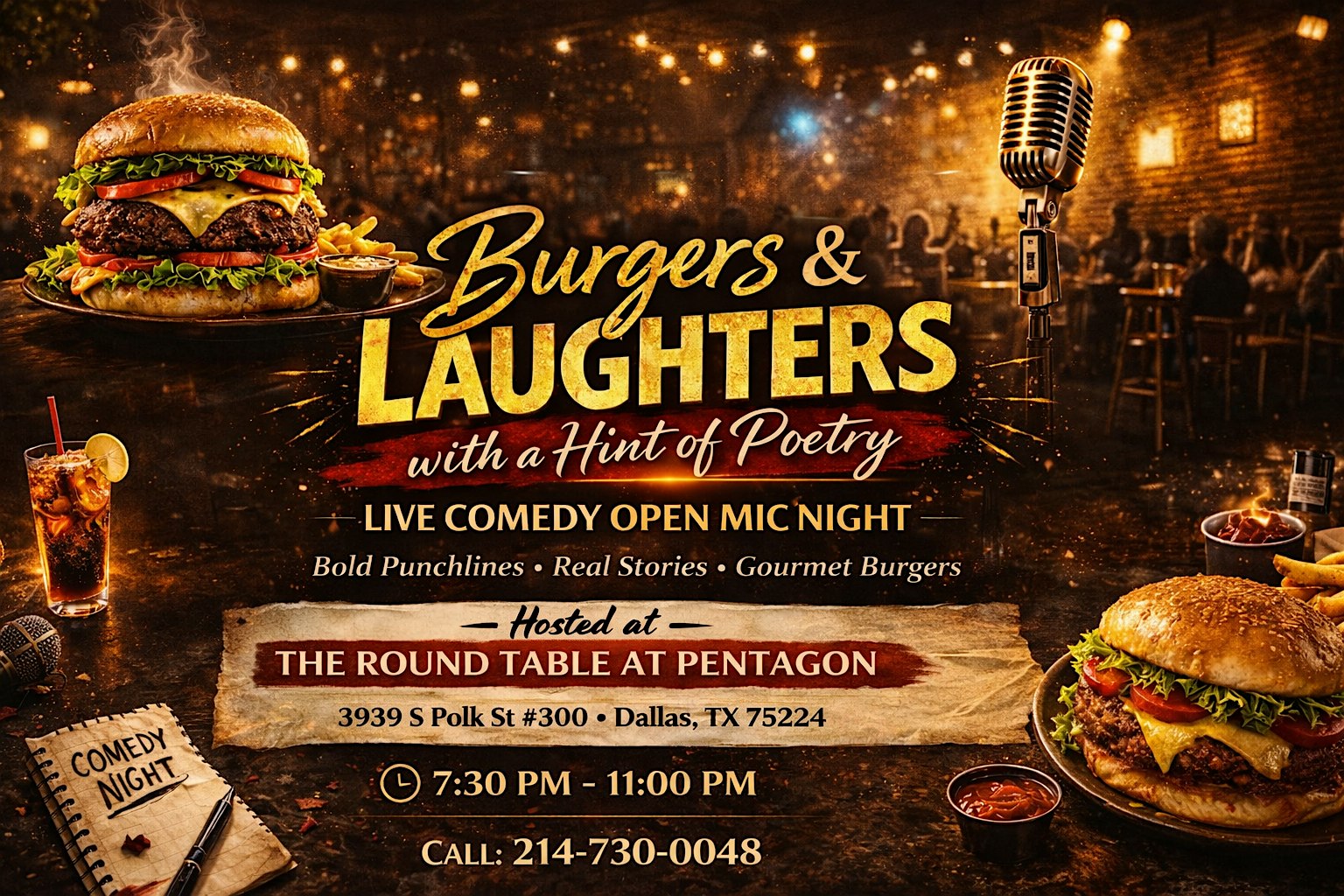 by admin27Feb Burgers and Laughter with a hint of Poetry at The Round Table at Pentagon – Dallas, TX Burgers and Laughter with a hint of Poetry at The Round Table at Pentagon – Dallas, TX 1 1 people viewed this event. Juicy burgers, laughs galore, and a splash of poetry—all served up live for a fun night out! Tickets-RSVP Link Date And Time Saturday, March 7th, 2026 07:00 PM (PST) Venue The Round Table at Pentagon Location 3939 South Polk Street #300, Dallas, TX 75224 Event Types Food & DrinkParty or Social Gathering Event Category DallasTexas Share With Friends Facebook Twitter Linkedin Xing Pinterest Share This Post: