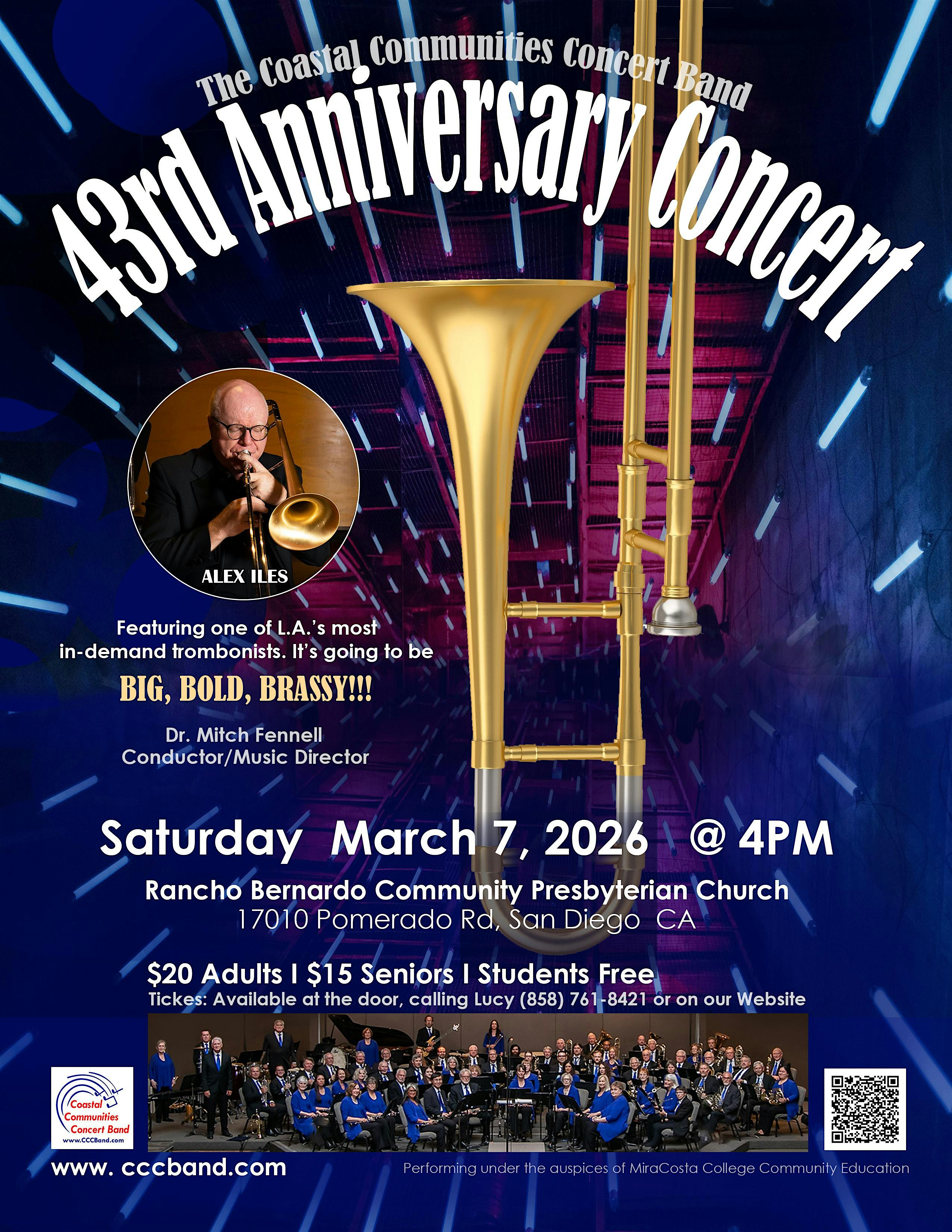 by admin23Feb Coastal Communities Concert Band 44th Anniversary Concert at Rancho Bernardo Community Presbyterian Church – San Diego, CA Coastal Communities Concert Band 44th Anniversary Concert at Rancho Bernardo Community Presbyterian Church – San Diego, CA 3 3 people viewed this event. Join us for a celebration of our 44th concert season! Tickets-RSVP Link Date And Time Saturday, March 7th, 2026 04:00 PM (PST) Venue Rancho Bernardo Community Presbyterian Church Location 17010 Pomerado Road, San Diego, CA 92128 Event Types Concert or PerformanceMusic Event Category CaliforniaSan Diego Share With Friends Facebook Twitter Linkedin Xing Pinterest Share This Post: