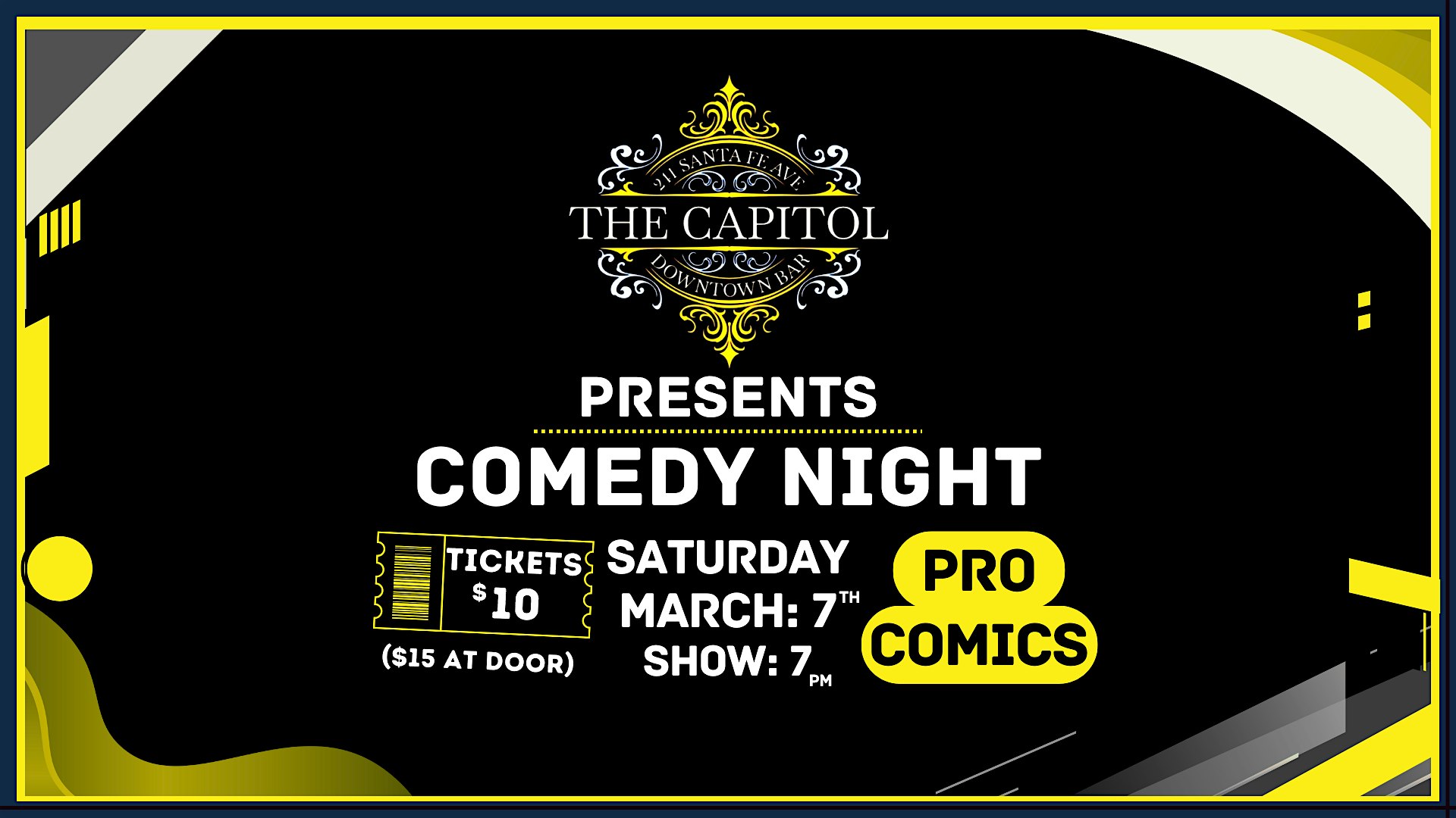 by admin05Mar Comedy Night in Pueblo at The Capitol Downtown Bar – Pueblo, CO Comedy Night in Pueblo at The Capitol Downtown Bar – Pueblo, CO 1 1 people viewed this event. The Capitol Downtown Bar Presents Comedy Night Saturday March 7th, Show at 7pm, but get there early for good seats, food and drinks! Tickets-RSVP Link Date And Time Saturday, March 7th, 2026 07:00 PM (PST) Venue The Capitol Downtown Bar Location 241 South Santa Fe Avenue, Pueblo, CO 81003 Event Types Concert or PerformanceFilm, Media & Entertainment Event Category Colorado Share With Friends Facebook Twitter Linkedin Xing Pinterest Share This Post: