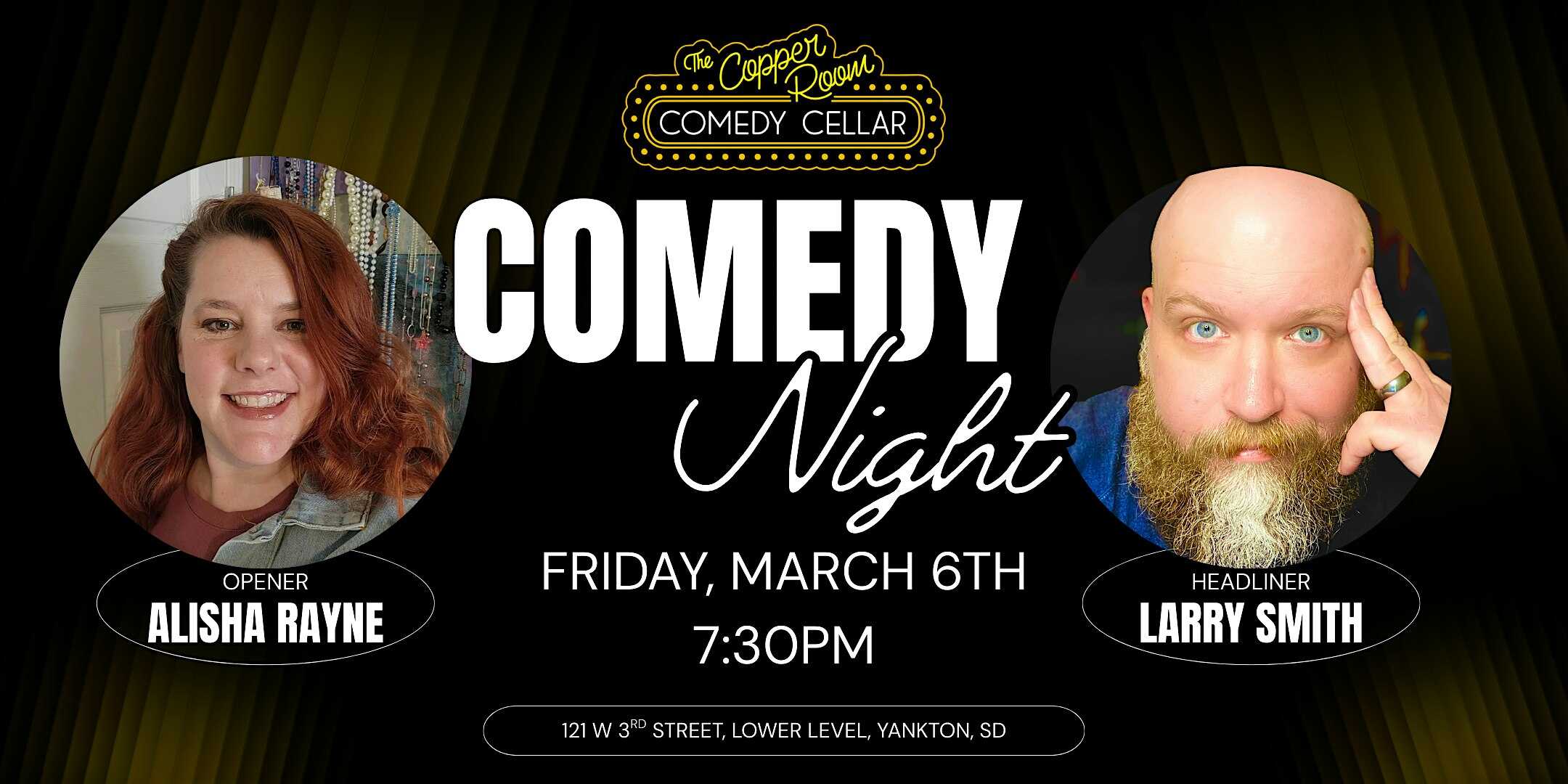 by admin14Feb Comedy Night with Larry Smith & Alisha Rayne at Copper Room Comedy Cellar – Yankton, SD Comedy Night with Larry Smith & Alisha Rayne at Copper Room Comedy Cellar – Yankton, SD 2 2 people viewed this event. Join us for a night of laughs with Larry Smith & Alisha Rayne Tickets-RSVP Link Date And Time Saturday, March 7th, 2026 01:00 AM (PST) Venue Copper Room Comedy Cellar Location 121 West 3rd Street, Yankton, SD 57078 Event Types Concert or PerformancePerforming & Visual Arts Event Category South Dakota Share With Friends Facebook Twitter Linkedin Xing Pinterest Share This Post: