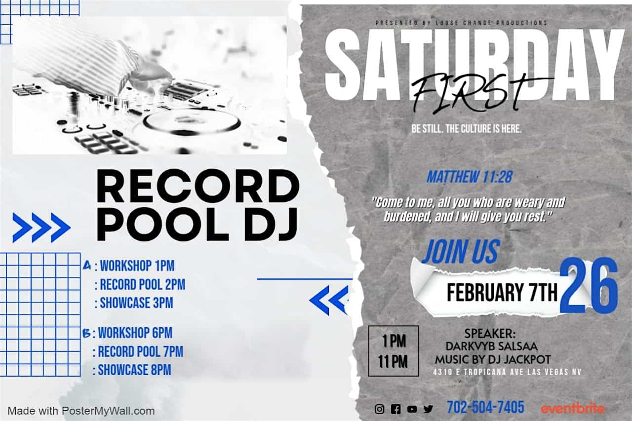 by admin23Feb DJ RECORD POOL at 4310 E Tropicana Ave – Las Vegas, NV DJ RECORD POOL at 4310 E Tropicana Ave – Las Vegas, NV 2 2 people viewed this event. : Workshop 1PM : record pool 2PM : showcase 3PM Tickets-RSVP Link Date And Time Saturday, March 7th, 2026 07:00 PM (PST) Venue 4310 E Tropicana Ave Location 4310 East Tropicana Avenue, Las Vegas, NV 89121 Event Types Concert or PerformanceMusic Event Category Las VegasNevada Share With Friends Facebook Twitter Linkedin Xing Pinterest Share This Post: