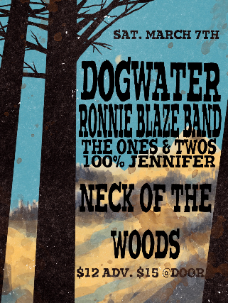 DogwaterRonnie BlazeThe Ones and Twos100% JenniferSaturday March 7th 2026Neck of the Woods 406 Clement St San Francisco, CA 94118$12 in adv $15 at the doorDoors at 7:30pmALL AGES