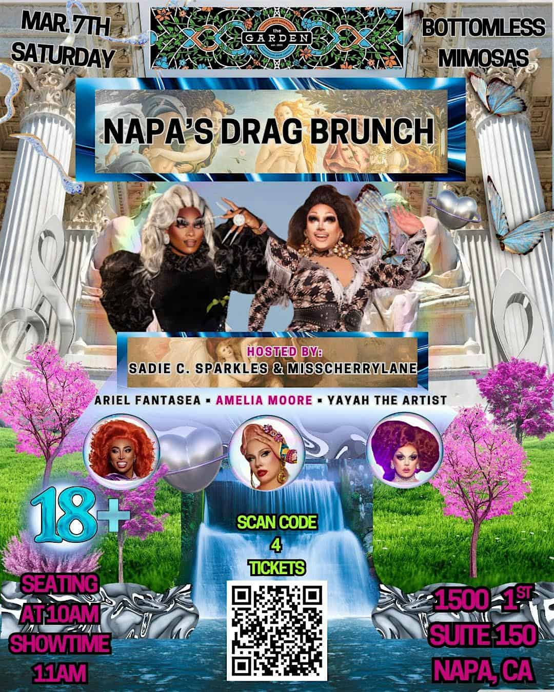 by admin14Feb DRAG SHOW BRUNCH at The Garden by Tannery Bend Beerworks – Napa, CA DRAG SHOW BRUNCH at The Garden by Tannery Bend Beerworks – Napa, CA 2 2 people viewed this event. Hosted by Sadie C. Sparkles and Miss Cherry Lane with Special Guests Ariel Fantasea, Amelia Moore and YahYah the Artist. Tickets-RSVP Link Date And Time Saturday, March 7th, 2026 06:00 PM (PST) Venue The Garden by Tannery Bend Beerworks Location 1500 1st Street, Napa, CA 94559 Event Types Party or Social GatheringPerforming & Visual Arts Event Category California Share With Friends Facebook Twitter Linkedin Xing Pinterest Share This Post: