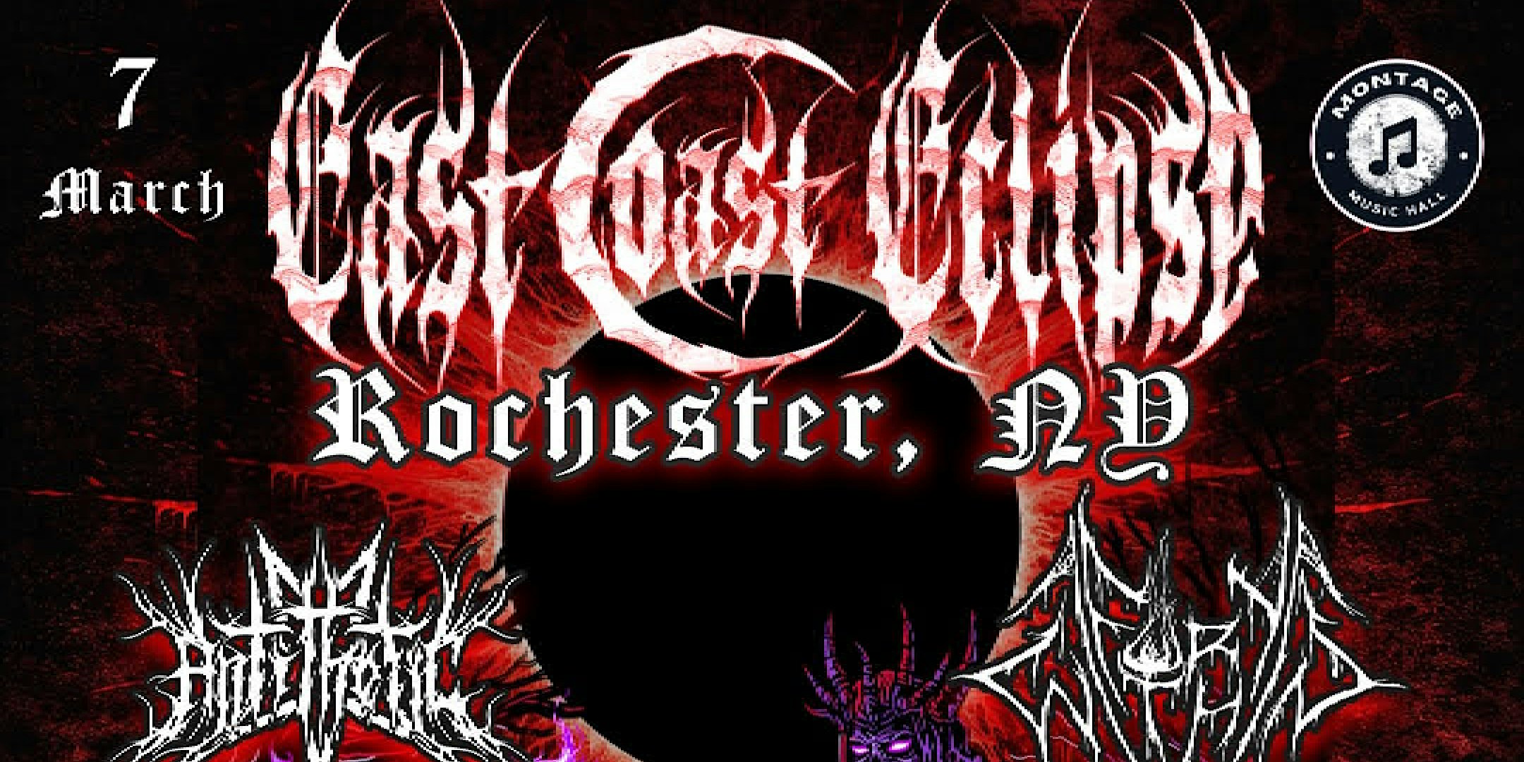 by admin23Feb EAST COAST ECLIPSE IN ROCHESTER, NY at Montage Music Hall – Rochester, NY EAST COAST ECLIPSE IN ROCHESTER, NY at Montage Music Hall – Rochester, NY 2 2 people viewed this event. Melodic black metal in Rochester NY featuring Fury Within, Antithetic & local support. March 7th at Montage Music Hall. 55 Chestnut St. Tickets-RSVP Link Date And Time Saturday, March 7th, 2026 06:00 PM (PST) Venue Montage Music Hall Location 55 Chestnut Street, Rochester, NY 14604 Event Types Concert or PerformanceMusic Event Category New York Share With Friends Facebook Twitter Linkedin Xing Pinterest Share This Post: