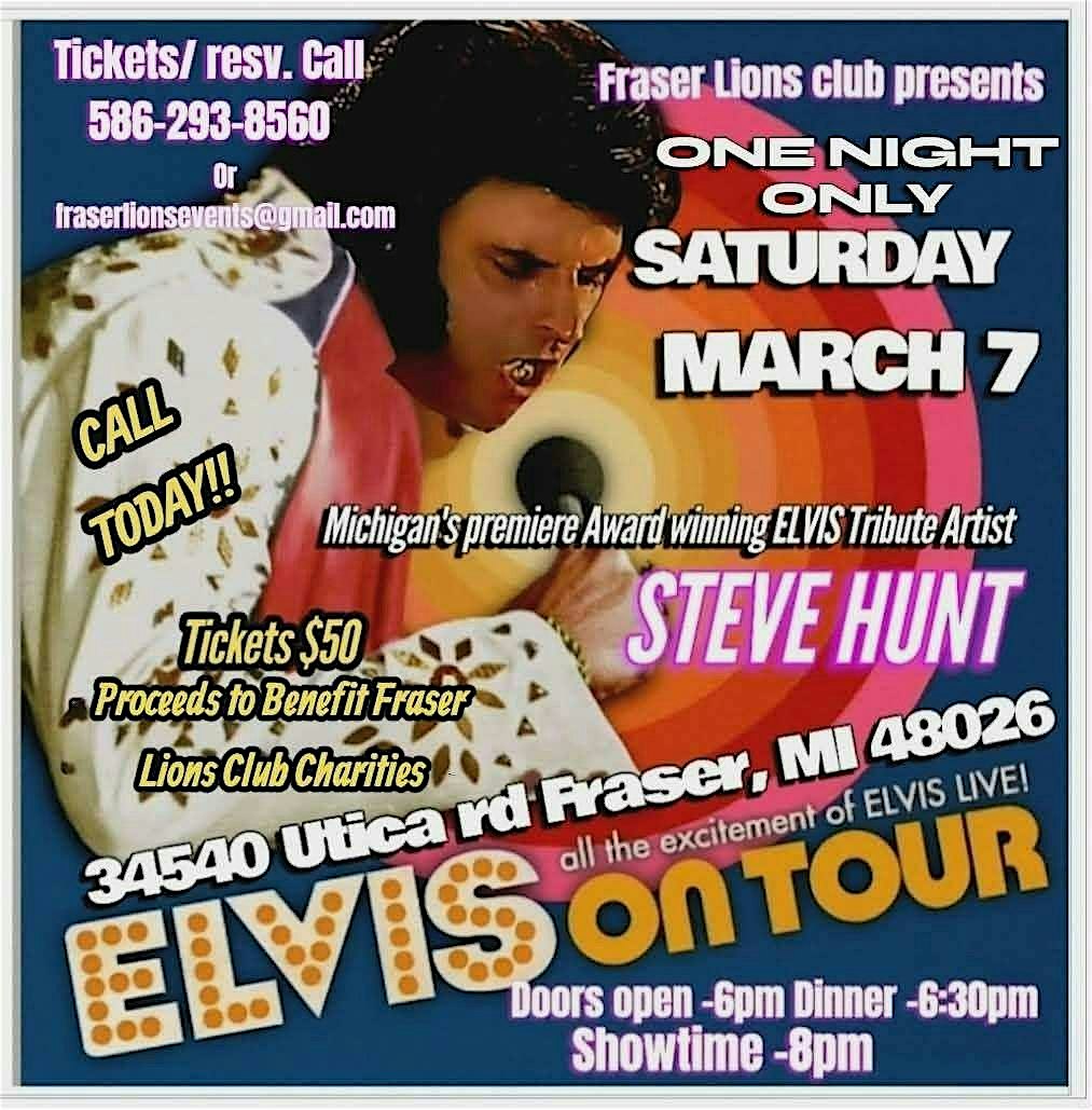 by admin13Feb ELVIS On Tour at the Fraser Lions Club at Fraser Lions Club – Fraser, MI ELVIS On Tour at the Fraser Lions Club at Fraser Lions Club – Fraser, MI 2 2 people viewed this event. Join us at Mr. Steve Hunt transforms into the BEST Elvis around for a terrific dinner & show! Tickets-RSVP Link Date And Time Saturday, March 7th, 2026 11:00 AM (PST) Venue Fraser Lions Club Location 34540 Utica Road, Fraser, MI 48026 Event Types Concert or PerformanceMusic Event Category Michigan Share With Friends Facebook Twitter Linkedin Xing Pinterest Share This Post: