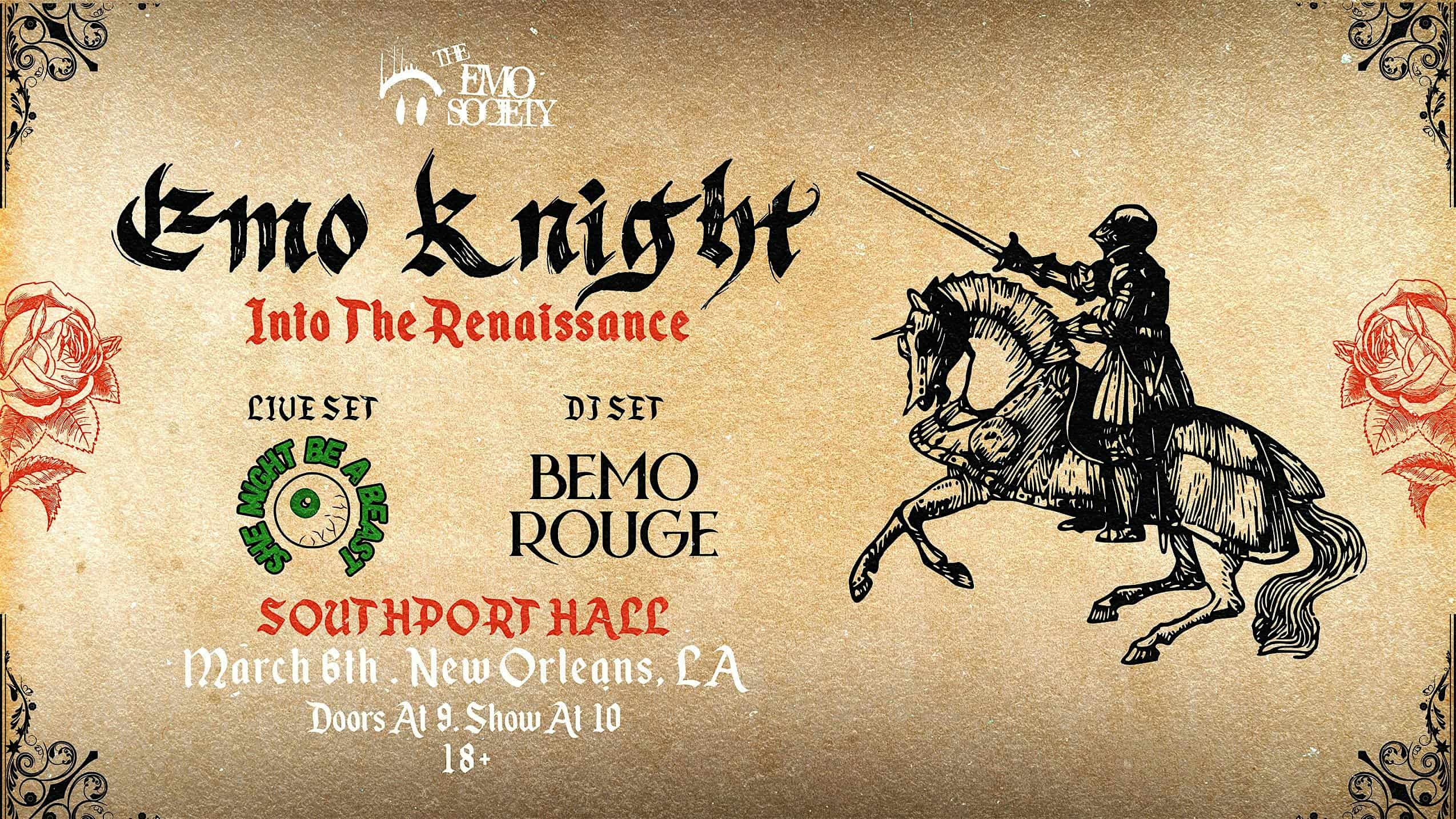 by admin14Feb Emo Knight: Into The Renaissance at Southport Hall – New Orleans, LA Emo Knight: Into The Renaissance at Southport Hall – New Orleans, LA 2 2 people viewed this event. Join Us for Emo Knight: Into The Renaissance featuring a live set from She Might Be A Beast and DJ set from Bemo Rouge at Southport Hall! Tickets-RSVP Link Date And Time Saturday, March 7th, 2026 04:00 AM (PST) Venue Southport Hall Location 200 Monticello Avenue, New Orleans, LA 70121 Event Types Concert or PerformancePerforming & Visual Arts Event Category LouisianaNew Orleans Share With Friends Facebook Twitter Linkedin Xing Pinterest Share This Post: