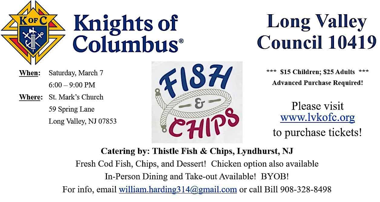 by admin14Feb Fish & Chips Dinner by Thistle Catering at St Mark the Evangelist Roman Catholic Church – Washington Township, NJ Fish & Chips Dinner by Thistle Catering at St Mark the Evangelist Roman Catholic Church – Washington Township, NJ 2 2 people viewed this event. Fish & Chips Dinner by Thistle Fish & Chips hosted by the Long Valley Knights of Columbus Council 10419! In-Person Dining or Take-out! Tickets-RSVP Link Date And Time Saturday, March 7th, 2026 11:00 PM (PST) Venue St Mark the Evangelist Roman Catholic Church Location 59 Spring Lane, Washington Township, NJ 7853 Event Types Food & Drink Event Category New Jersey Share With Friends Facebook Twitter Linkedin Xing Pinterest Share This Post: