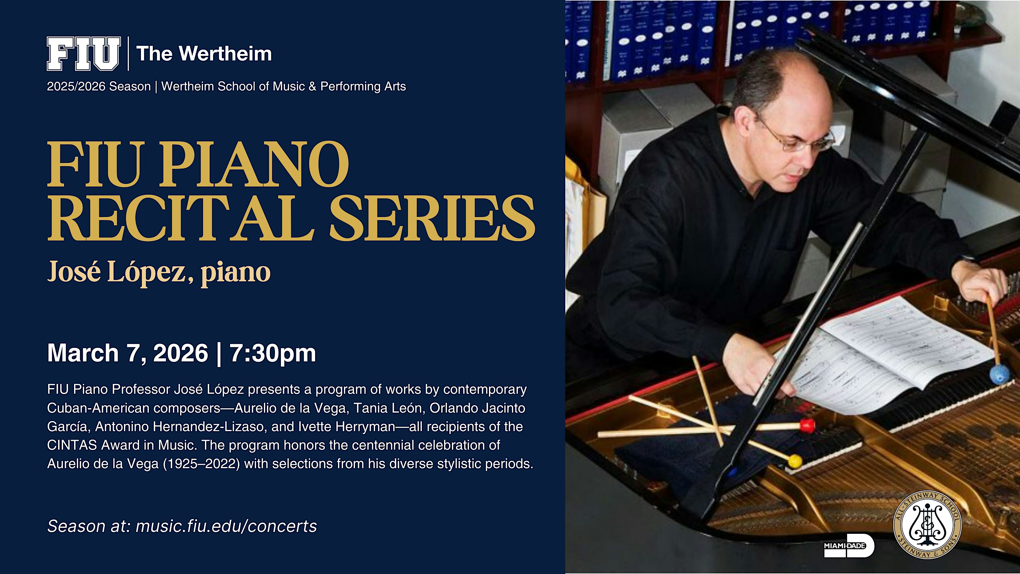 by admin23Feb FIU Piano Recital Series: José López, piano at Herbert and Nicole Wertheim School of Music & Performing Arts – Miami, FL FIU Piano Recital Series: José López, piano at Herbert and Nicole Wertheim School of Music & Performing Arts – Miami, FL 2 2 people viewed this event. – Tickets-RSVP Link Date And Time Saturday, March 7th, 2026 07:00 PM (PST) Venue Herbert and Nicole Wertheim School of Music & Performing Arts Location 10910 Southwest 17th Street, Miami, FL 33199 Event Types Concert or PerformanceMusic Event Category FloridaMiami Share With Friends Facebook Twitter Linkedin Xing Pinterest Share This Post: