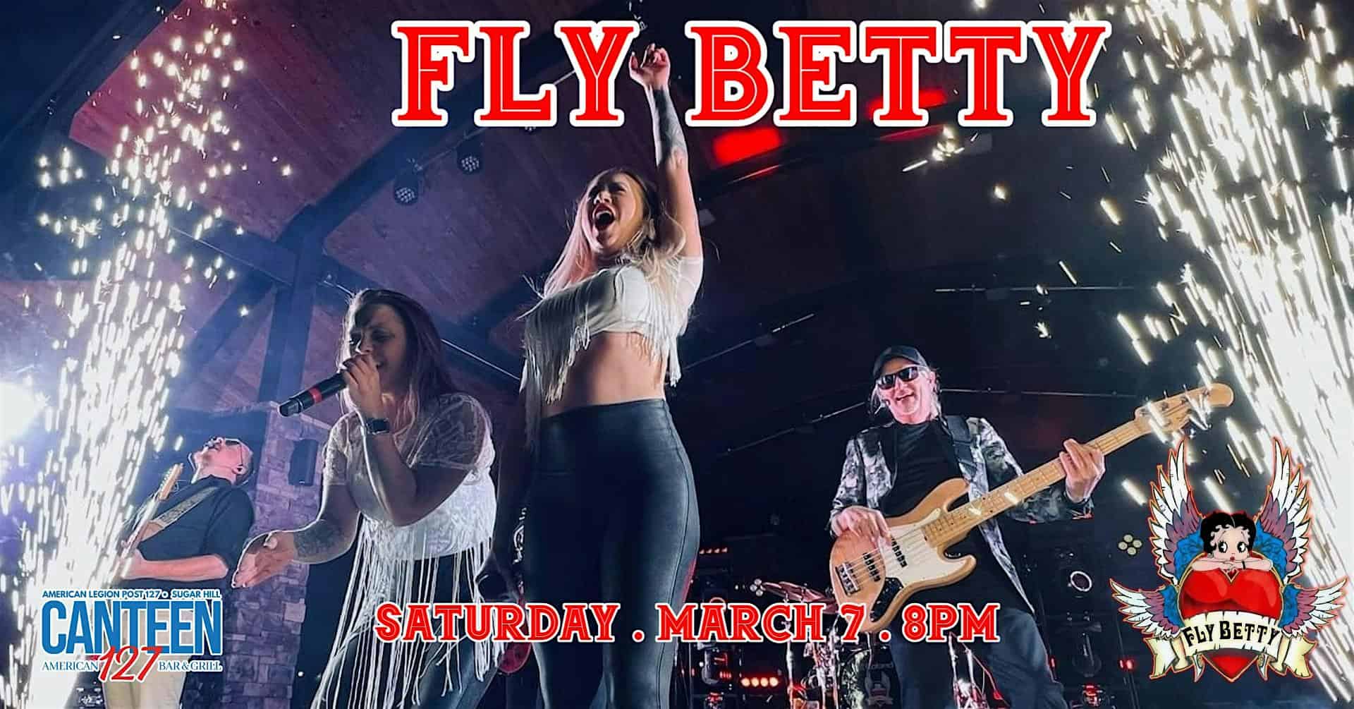 by admin23Feb Fly Betty at Canteen127 at American Legion Post 127 – Sugar Hill – Sugar Hill, GA Fly Betty at Canteen127 at American Legion Post 127 – Sugar Hill – Sugar Hill, GA 2 2 people viewed this event. Get ready to dance the night away at Fly Betty’s electrifying performance at Canteen127 – it’s going to be a wild ride! Tickets-RSVP Link Date And Time Saturday, March 7th, 2026 08:00 PM (PST) Venue American Legion Post 127 - Sugar Hill Location 6196 Suwanee Dam Road, Sugar Hill, GA 30518 Event Types Concert or PerformanceMusic Event Category Georgia Share With Friends Facebook Twitter Linkedin Xing Pinterest Share This Post: