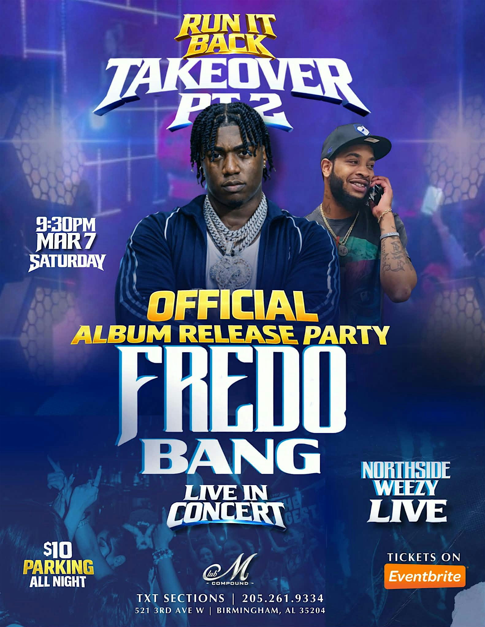 by admin05Mar Fredo Bang live in concert in Alabama at Club M – Birmingham, AL Fredo Bang live in concert in Alabama at Club M – Birmingham, AL 2 2 people viewed this event. Fredo Bang live in concert in Alabama Saturday March 7 @ Club M $30 concert doors open at 9:30 more info text 2052619334 Tickets-RSVP Link Date And Time Saturday, March 7th, 2026 09:00 PM (PST) Venue Club M Location 521 3rd Avenue West, Birmingham, AL 35204 Event Types Concert or PerformanceMusic Event Category AlabamaBirmingham Share With Friends Facebook Twitter Linkedin Xing Pinterest Share This Post: