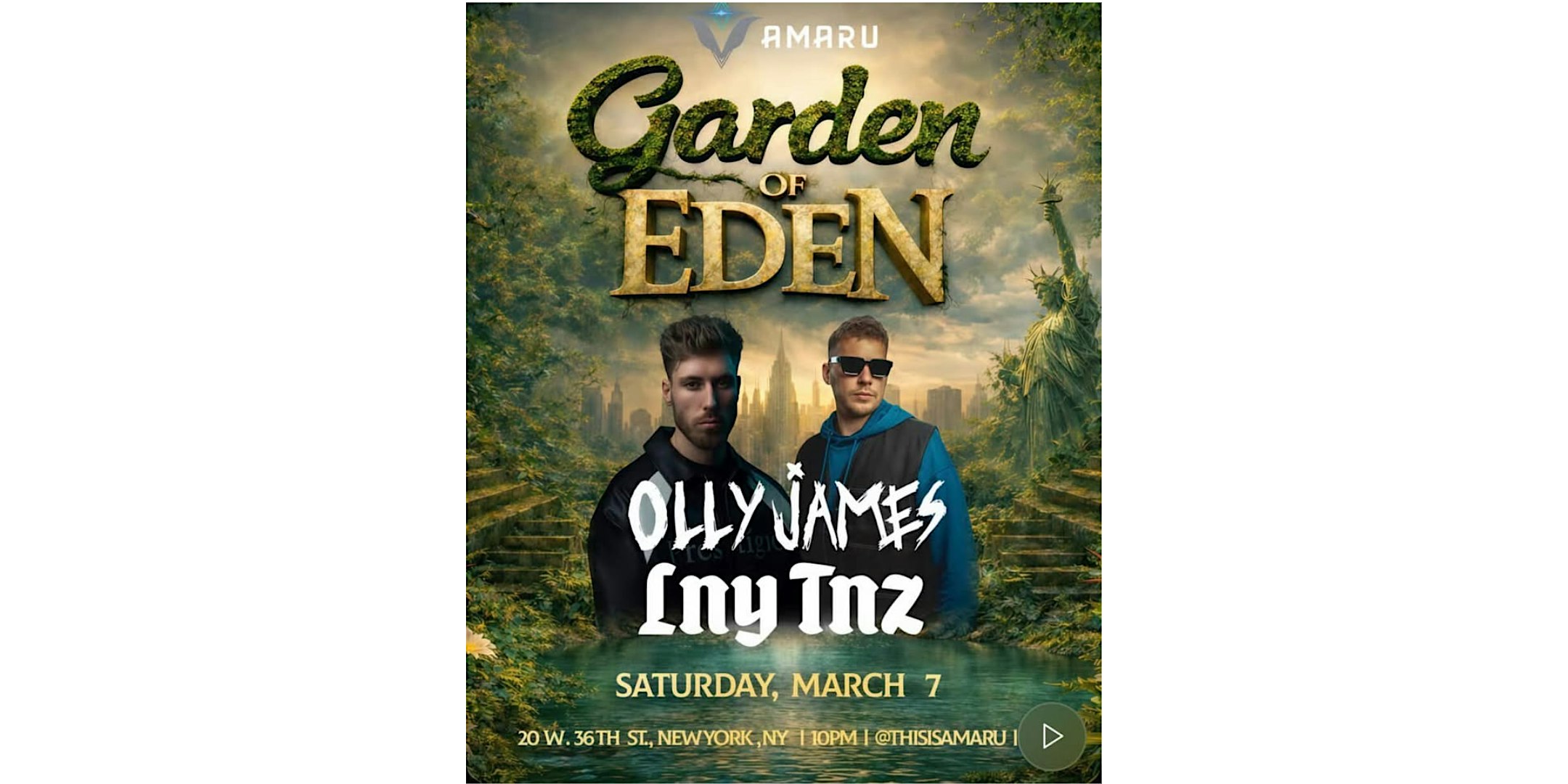 by admin27Feb Garden of Eden at EDEN – New York, NY Garden of Eden at EDEN – New York, NY 2 2 people viewed this event. NYC, the wait is over Join us at Eden NYC for a massive night as Olly James makes his NYC debut, joined by festival heavyweights LNY T Tickets-RSVP Link Date And Time Saturday, March 7th, 2026 10:00 PM (PST) Venue EDEN Location 20 West 36th Street, New York, NY 10018 Event Types Festival or FairMusic Event Category New YorkNew York City Share With Friends Facebook Twitter Linkedin Xing Pinterest Share This Post: