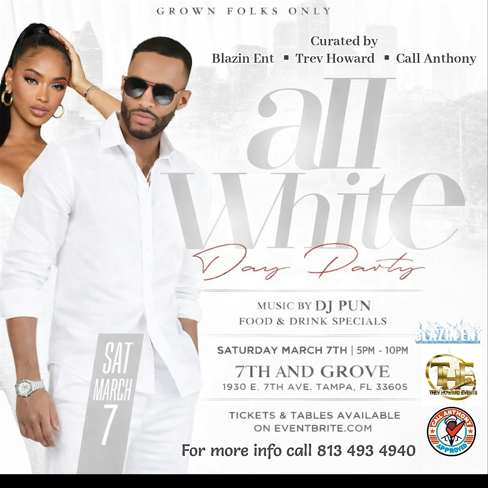 by admin27Feb Grown Folks Only “ALL WHITE” Day Party at 7th + Grove – Tampa, FL Grown Folks Only “ALL WHITE” Day Party at 7th + Grove – Tampa, FL 1 1 people viewed this event. Join us Saturday March 7th at 7th & Grove in beautiful Ybor City from 5pm til 10pm. This event is for the Mature Audience. Music by Dj Pun. Tickets-RSVP Link Date And Time Saturday, March 7th, 2026 05:00 PM (PST) Venue 7th + Grove Location 1930 East 7th Avenue, Tampa, FL 33605 Event Types Community & CultureParty or Social Gathering Event Category FloridaTampa Share With Friends Facebook Twitter Linkedin Xing Pinterest Share This Post: